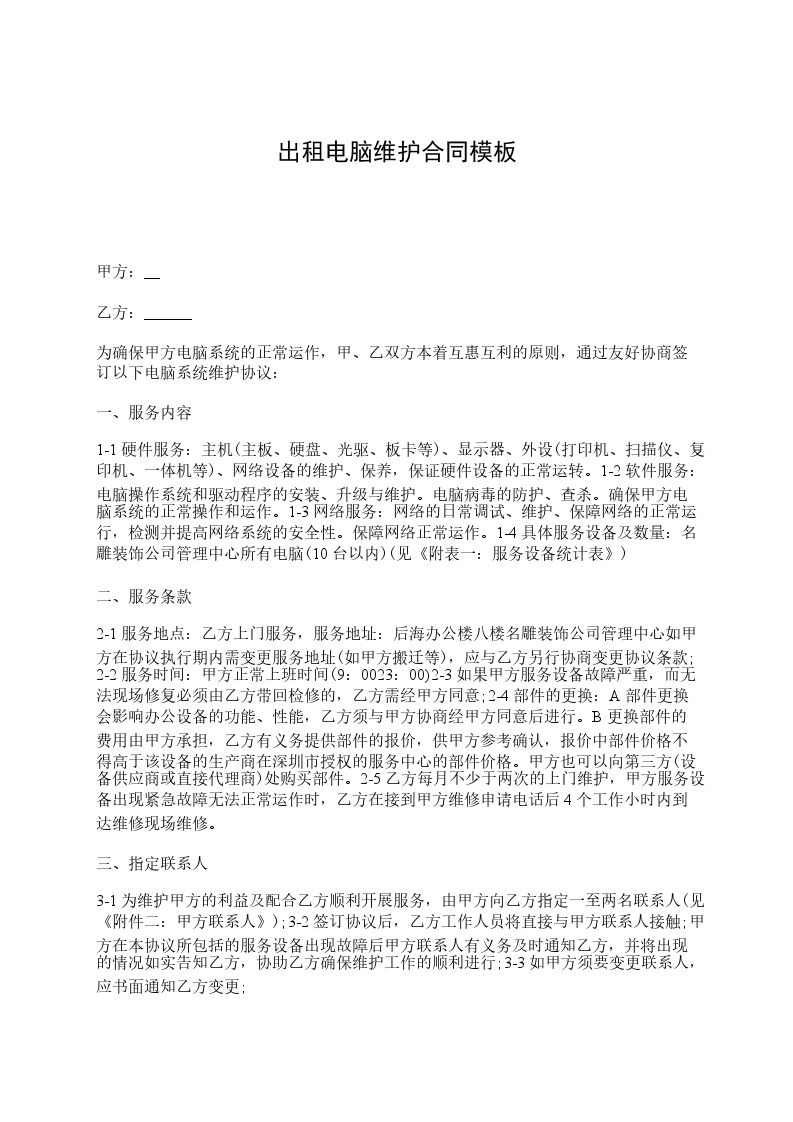2、如甲方提供的维修服务项目与协议不相符,乙方有权提前退还电脑,甲方应全额退还剩余的租金及电脑押金。