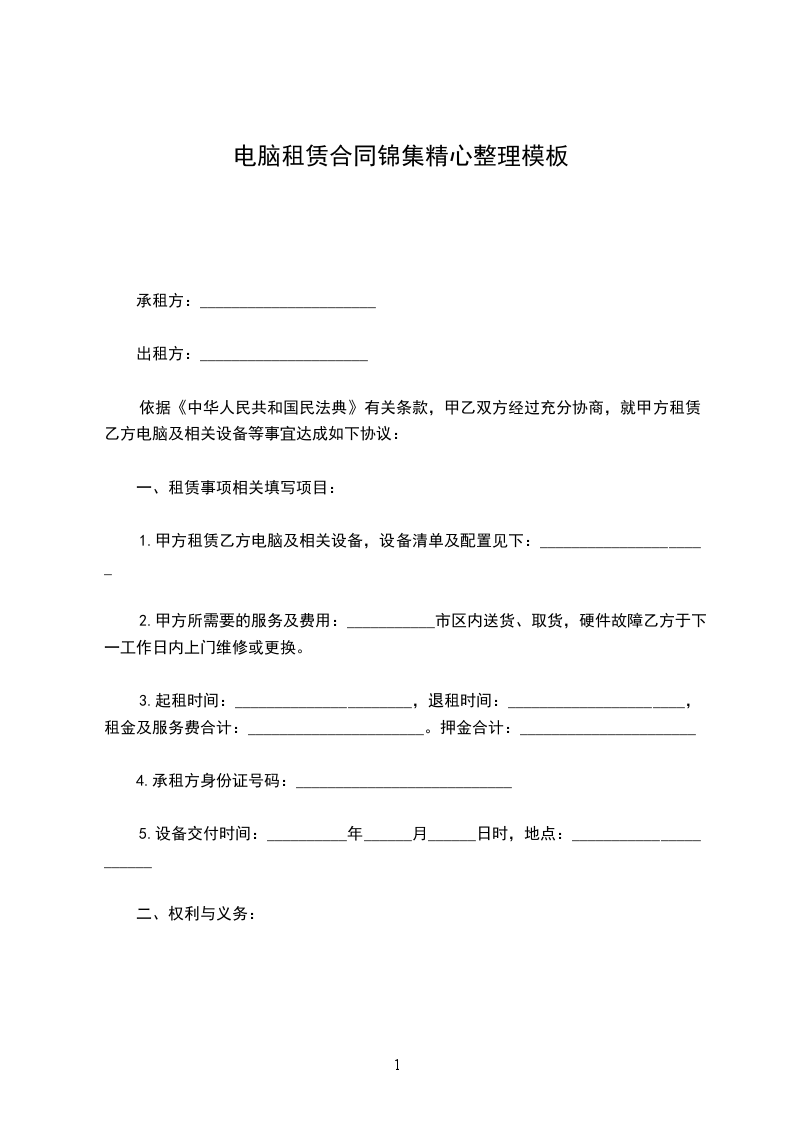二、起租时间:_________年_________月_________日,退租时间:_________年_________月_________日。在合同签订之日,乙方需向甲方支付电脑押金(大