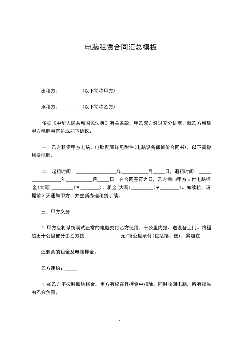 甲方愿意向乙方 ____________ 提供 ____________品牌 _________________ 型号 _____ 台 _______(租期)的租赁使用服务(详细电脑的配置请参照附表),乙方同意向甲方(________信息技术有限公司)支付______(元/天)的租金,同时先向甲方支付一定的押金,以相当于租用的电脑的市场价值为准,具体金额,具体情况双方协调决定。