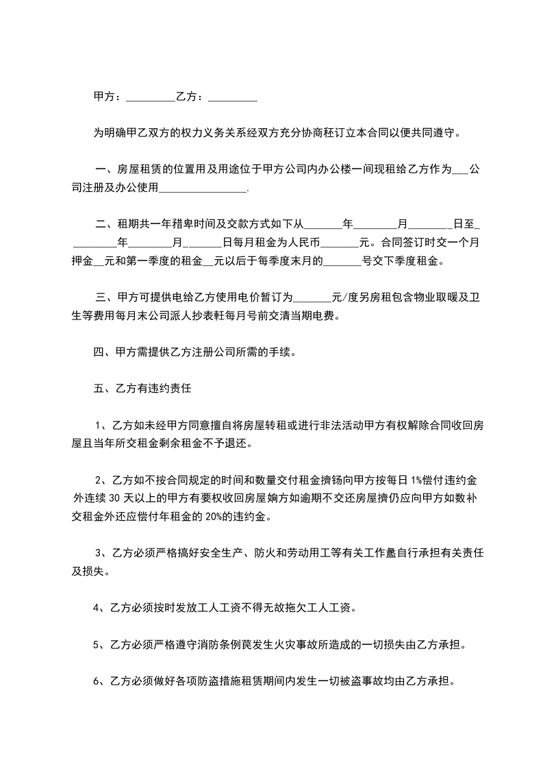 一、房屋租赁的位置用及用途位于甲方公司内办公楼一间现租给乙方作为___公司注册及办公使用________________.