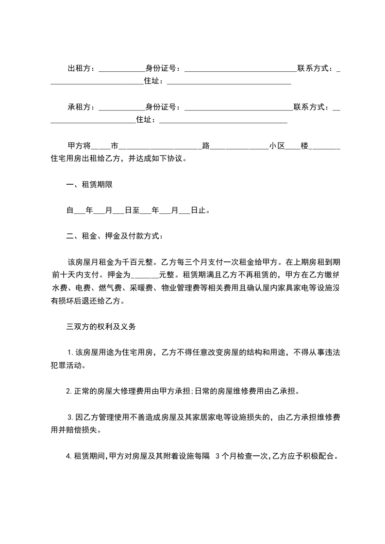 承租方:____________身份证号:____________________________联系方式:________________________住址:_________________________________