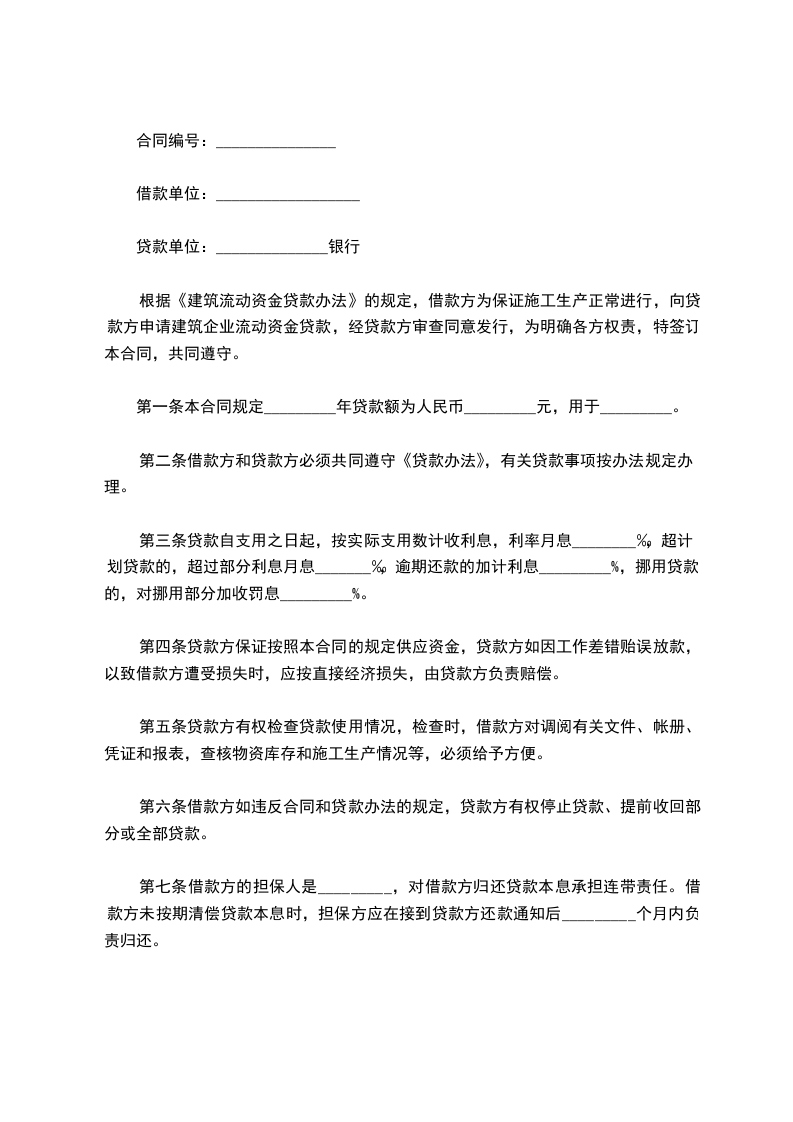 根据《建筑流动资金贷款办法》的规定,借款方为保证施工生产正常进行,向贷款方申请建筑企业流动资金贷款,经贷款方审查同意发行,为明确各方权责,特签订本合同,共同遵守。