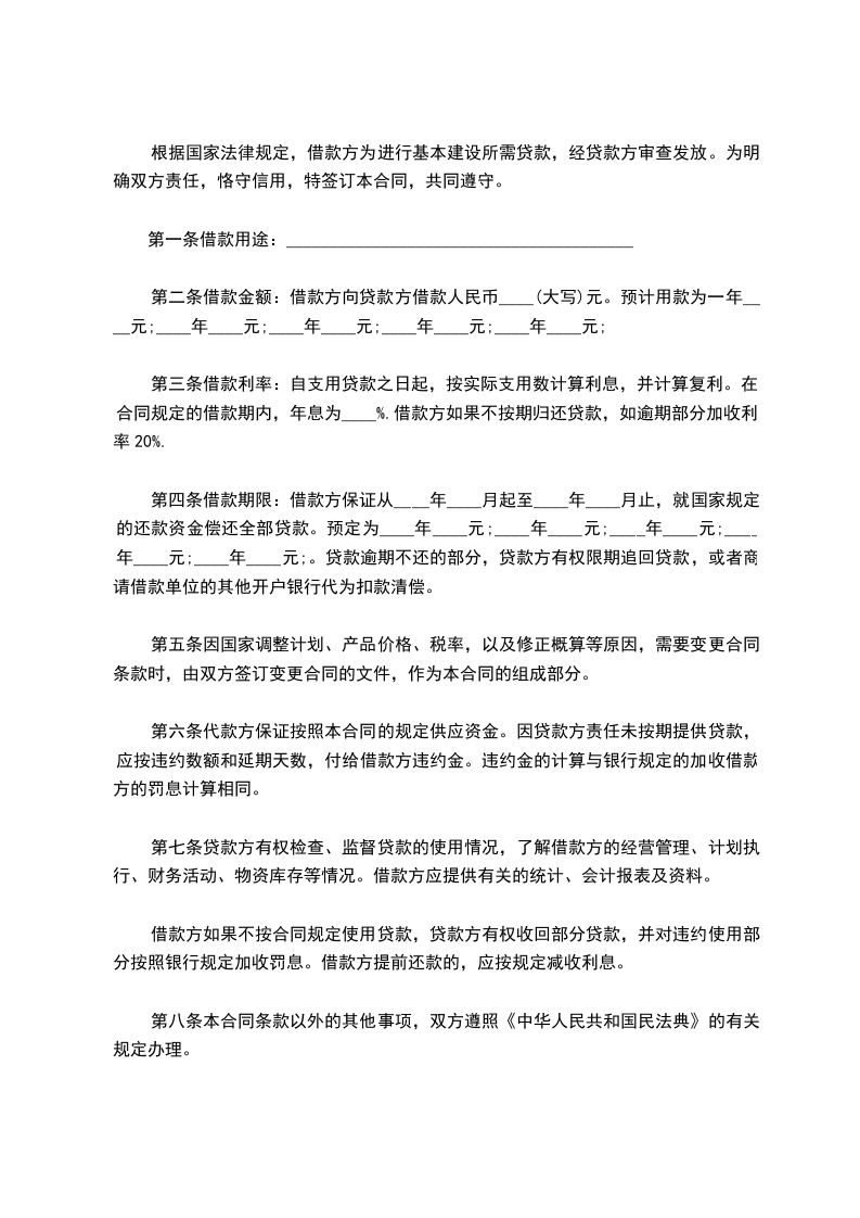 第一条本合同规定_________年贷款额为人民币_________元,用于_________。