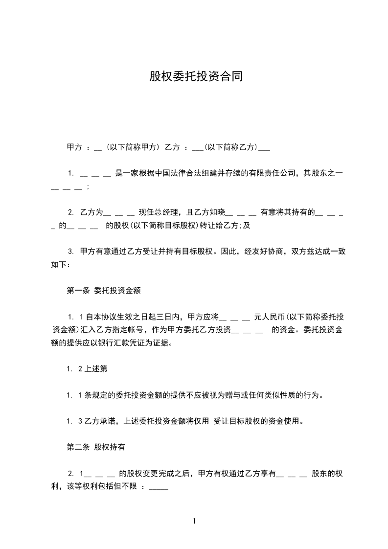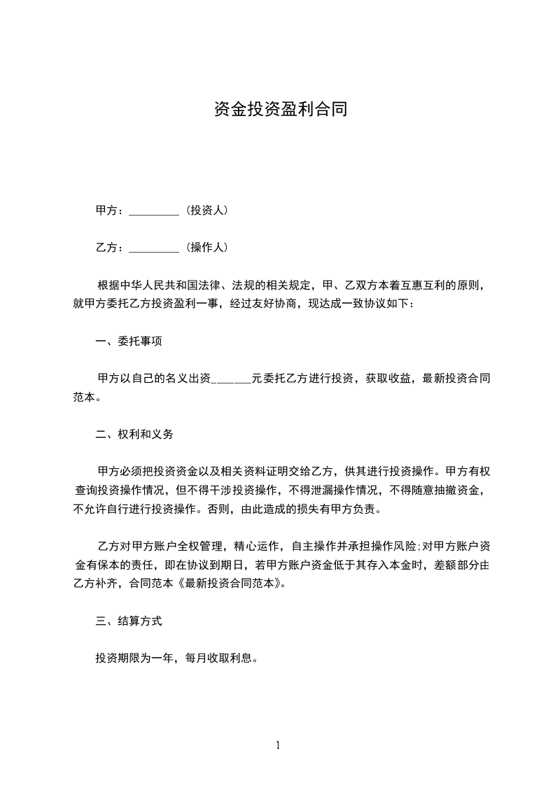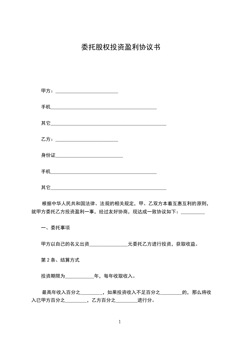 根据中华人民共和国法律、法规的相关规定,甲、乙双方本着互惠互利的原则,就甲方委托乙方投资盈利一事,经过友好协商,现达成一致协议如下:__________