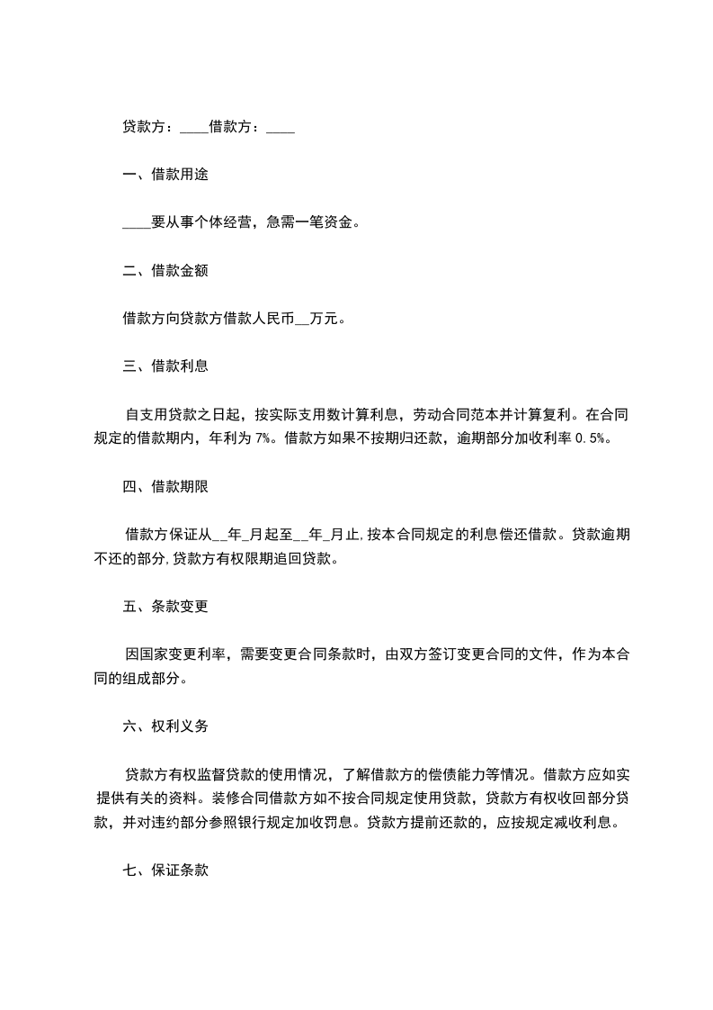 自支用贷款之日起,按实际支用数计算利息,劳动合同范本并计算复利。在合同规定的借款期内,年利为7%。借款方如果不按期归还款,逾期部分加收利率0.5%。