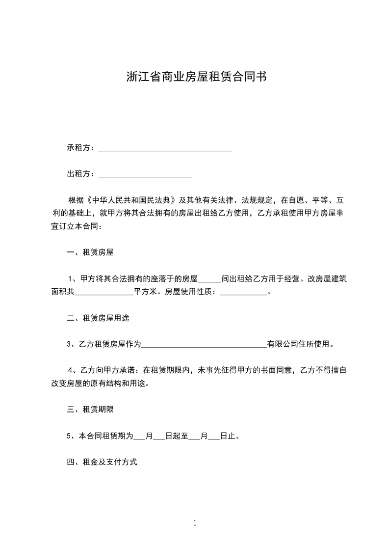 1、甲方将其合法拥有的座落于的房屋______间出租给乙方用于经营。改房屋建筑面积共_______________平方米。房屋使用性质:____________。