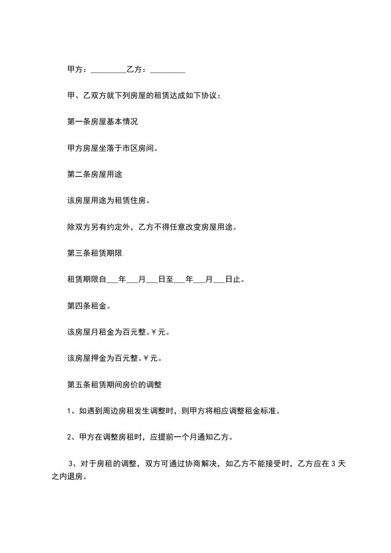 1、如遇到周边房租发生调整时,则甲方将相应调整租金标准。