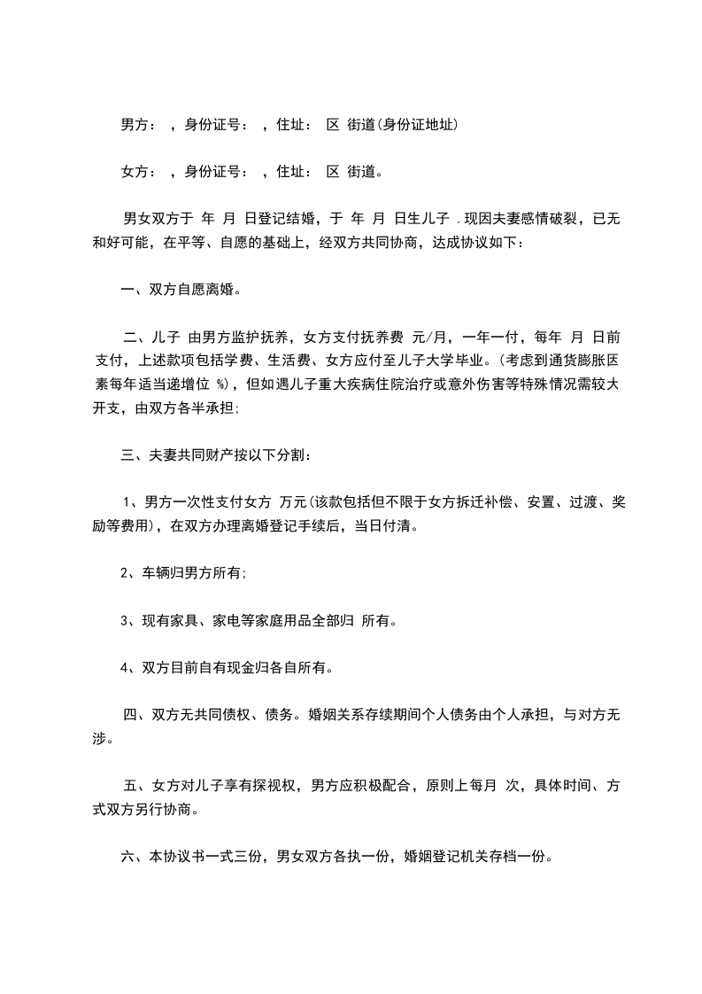 六、本协议书一式三份,男女双方各执一份,婚姻登记机关存档一份。