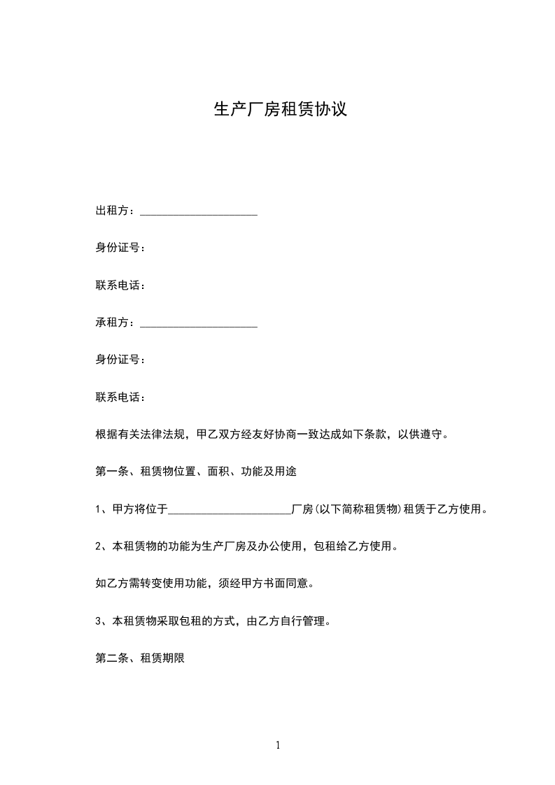 2、厂房租赁自_____年____月____日起,至____年____月____日止。租赁期______年。