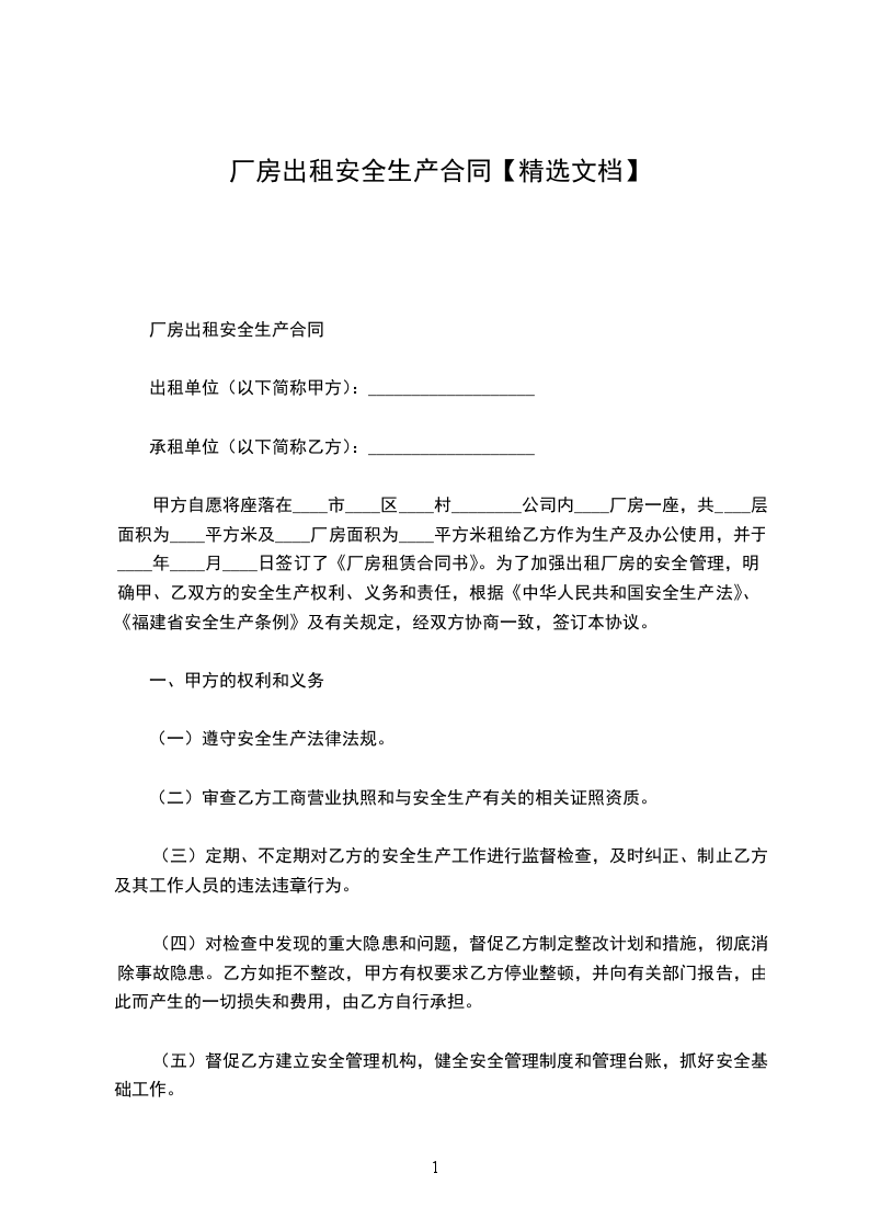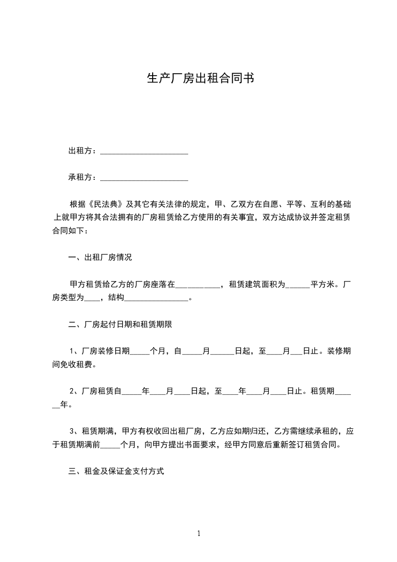 3、甲、乙双方一旦签订合同,乙方应向甲方支付厂房租赁保证金,保证金为___个月租金。租金应预付___个月,支付日期在支付月___日前向甲方支付租金。