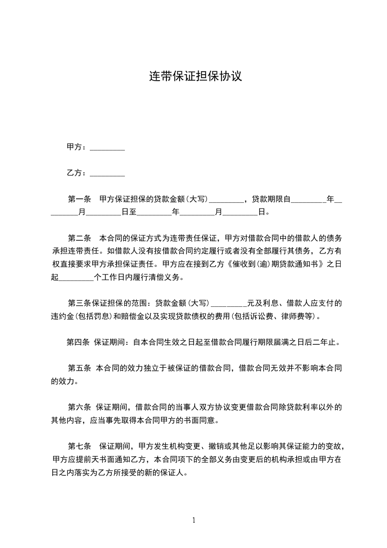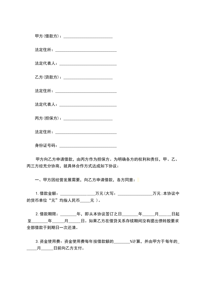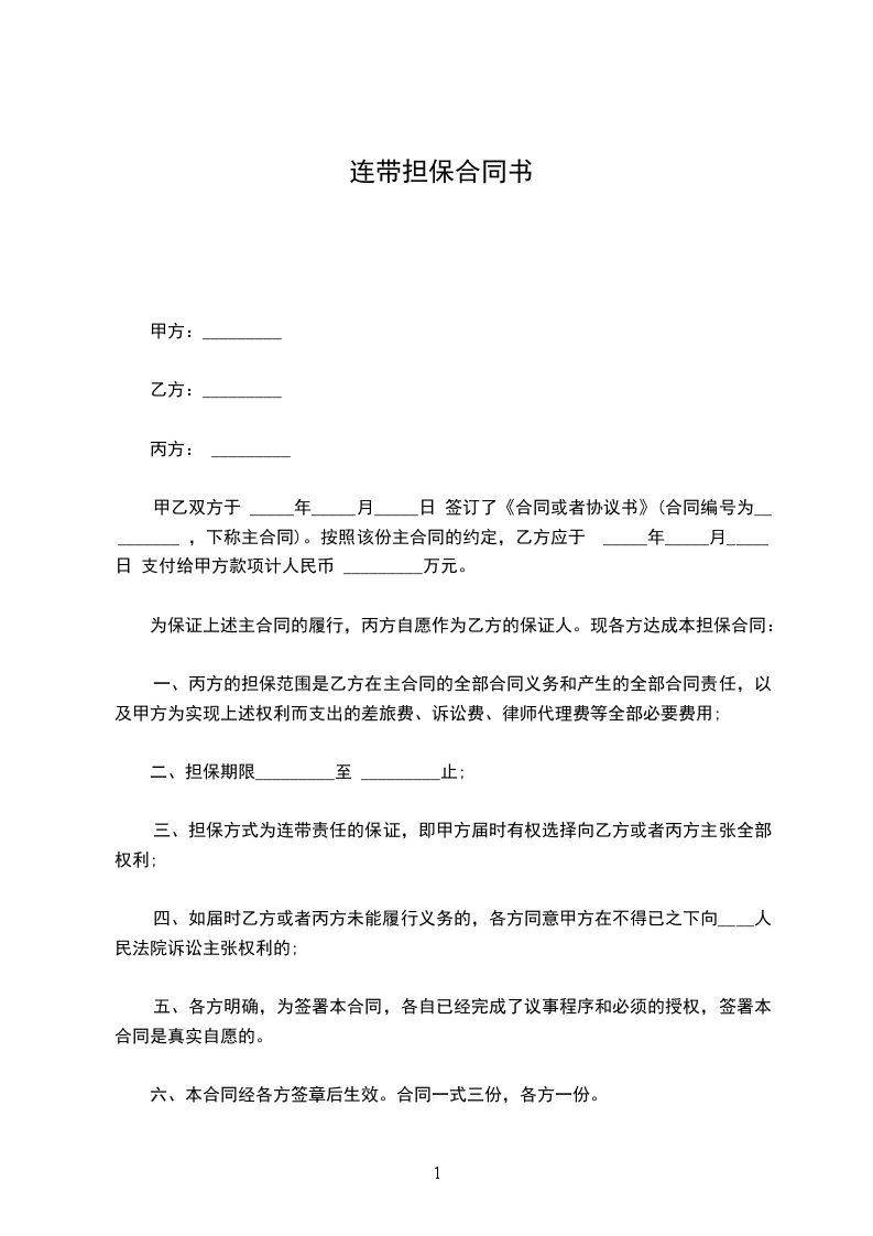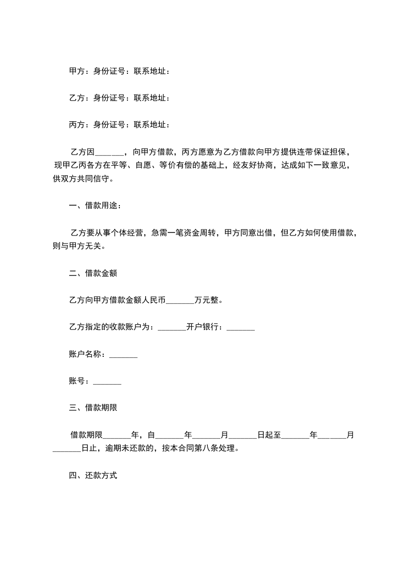 乙方因_______,向甲方借款,丙方愿意为乙方借款向甲方提供连带保证担保,现甲乙丙各方在平等、自愿、等价有偿的基础上,经友好协商,达成如下一致意见,供双方共同信守。