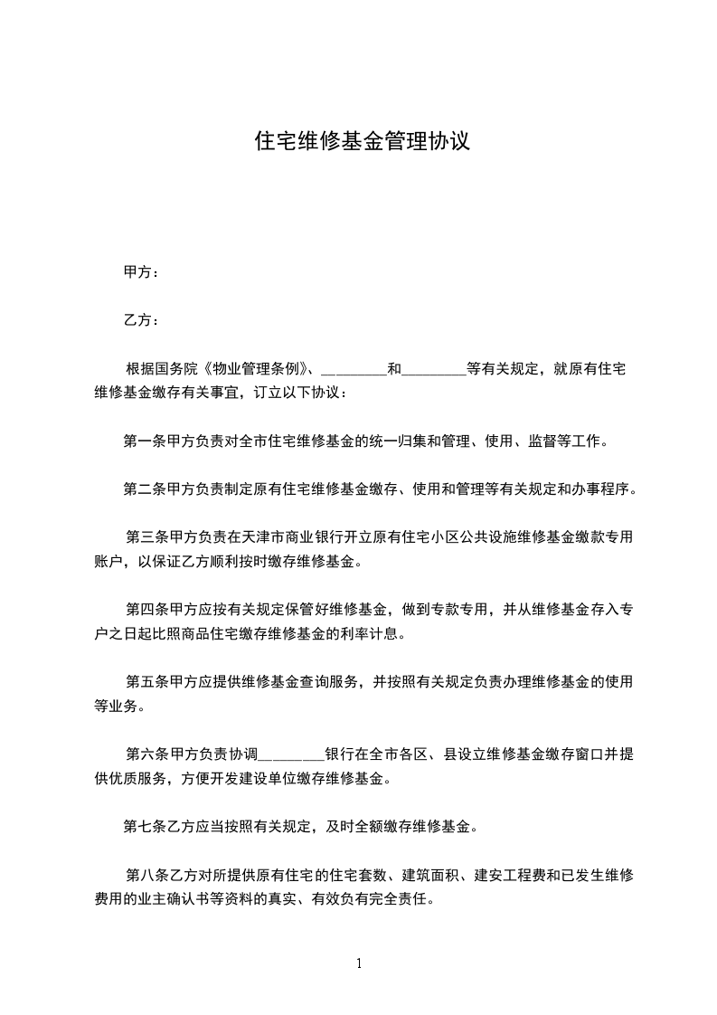 第三条甲方负责在天津市商业银行开立原有住宅小区公共设施维修基金缴款专用账户,以保证乙方顺利按时缴存维修基金。