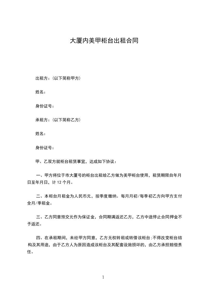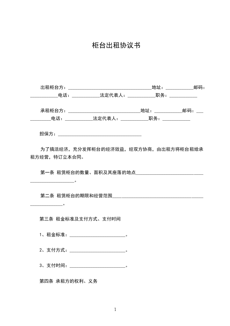 4、待乙方租房合同期满后,如不再继续租赁,将柜台交付给甲方时要完好。