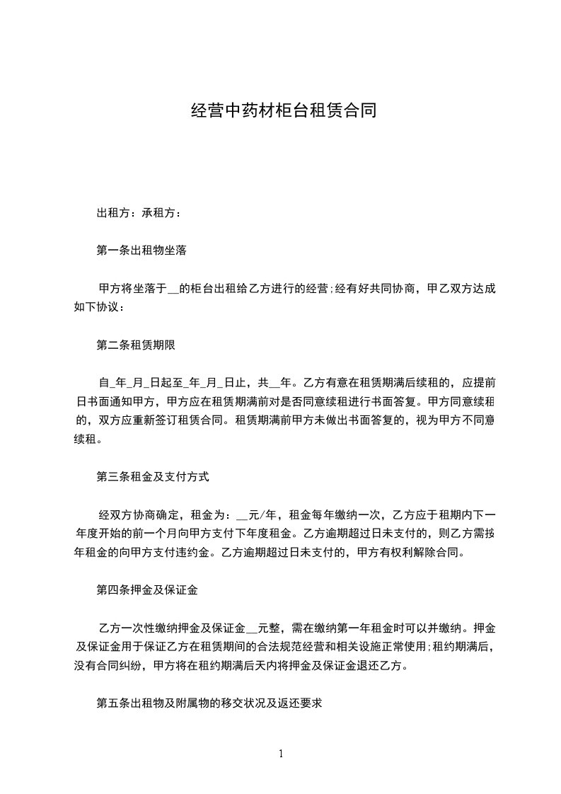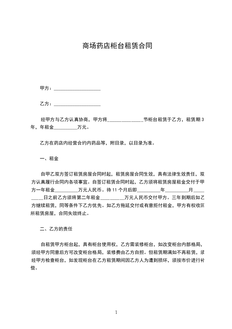 经甲方与乙方认真协商,甲方将长治市大药房__________节柜台租赁于乙方,租赁期3年,年租金__________万元。