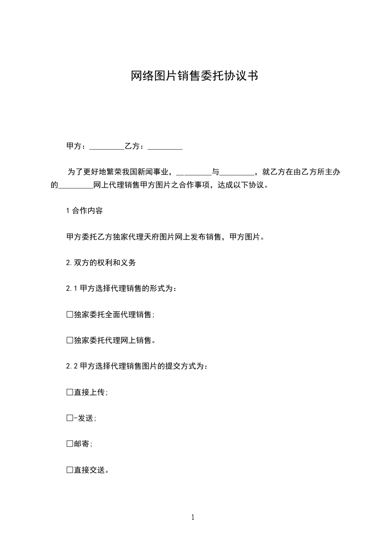 为了更好地繁荣我国新闻事业,_________与_________,就乙方在由乙方所主办的_________网上代理销售甲方图片之合作事项,达成以下协议。