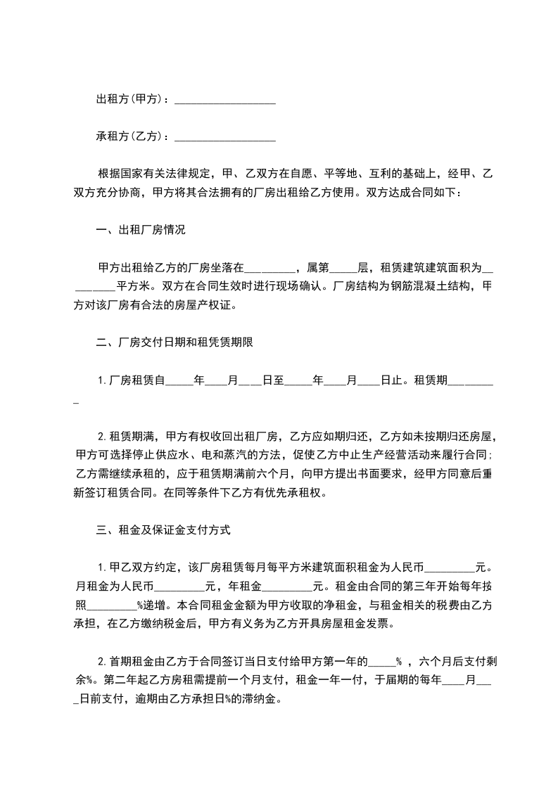 一、甲方租赁给乙方使用的厂房建筑面积约为____平方,其中:厂房面积为____平方米,宿舍面积为____平方米。该厂房为加工生产,乙方不得任意改变房屋的用途。