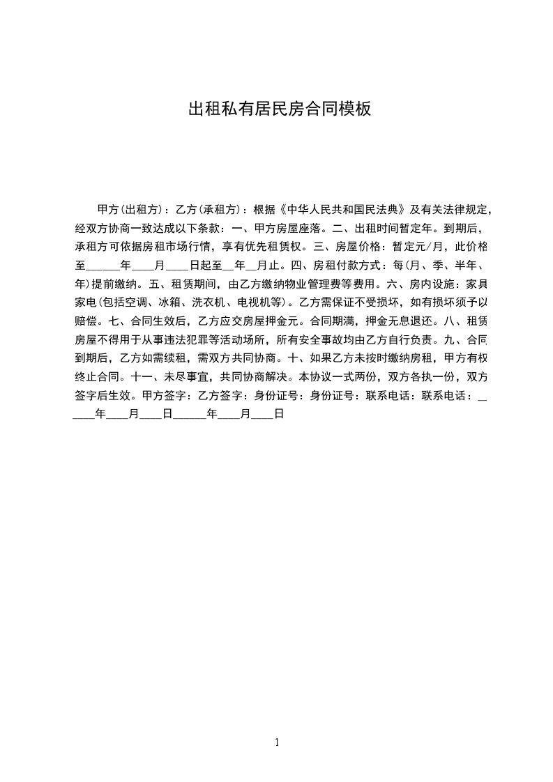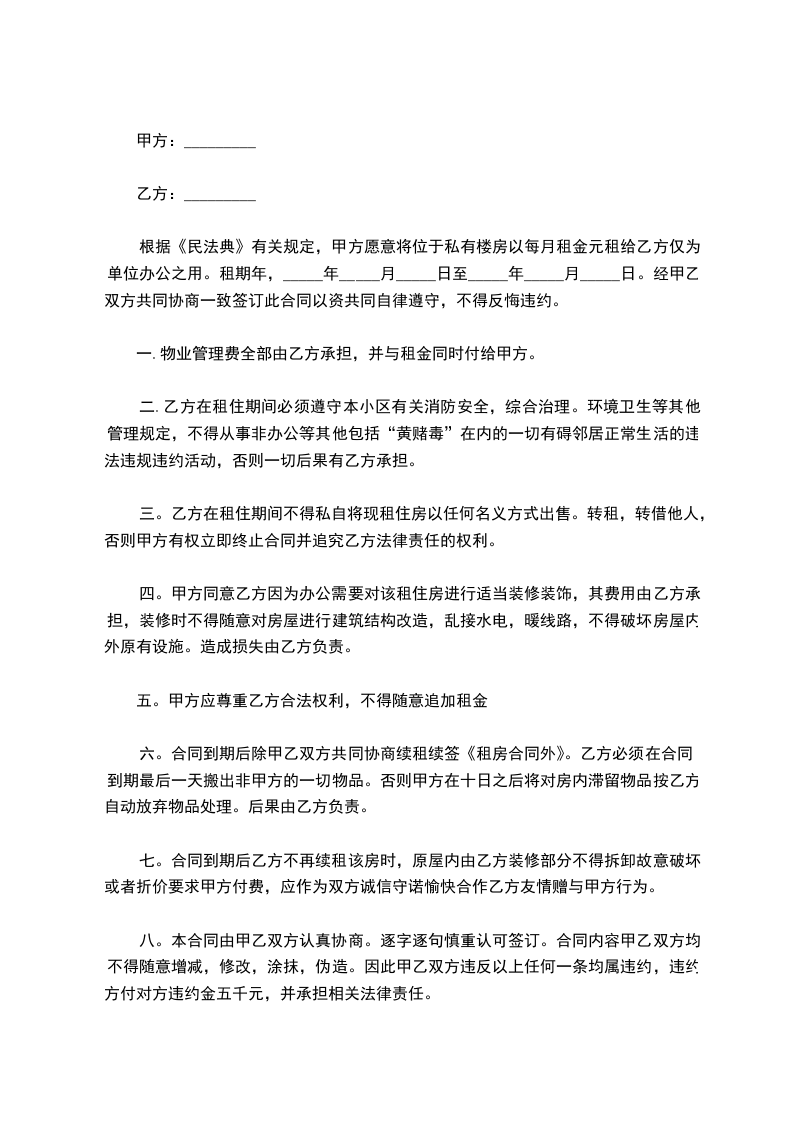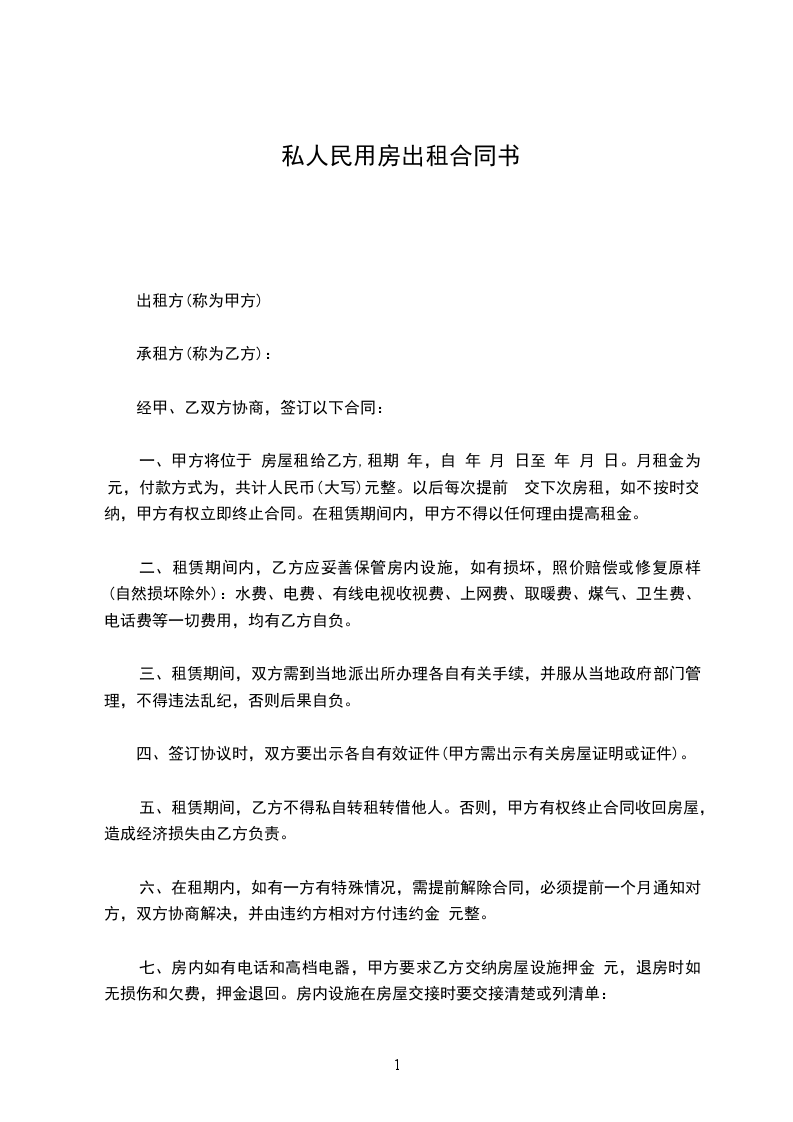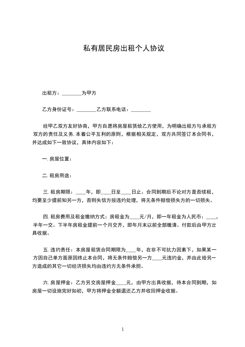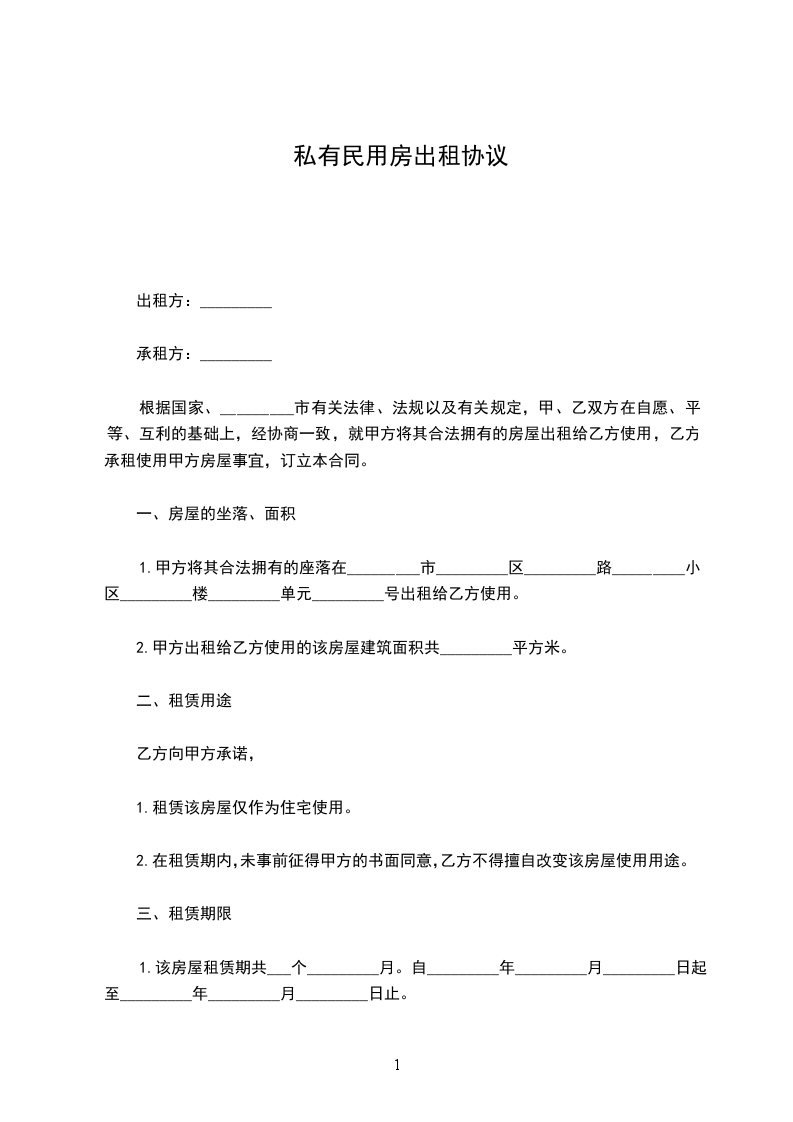 1.甲方将其合法拥有的座落在_________市_________区_________路_________小区_________楼_________单元_________号出租给乙方使用。