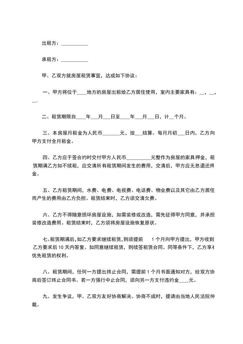 一、甲方将位于____地方的房屋出租给乙方居住使用,室内主要家具有:__,__,__.