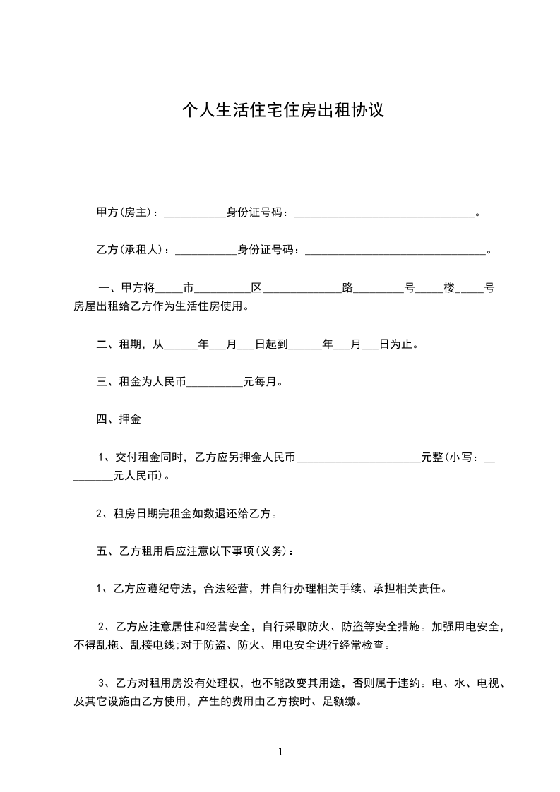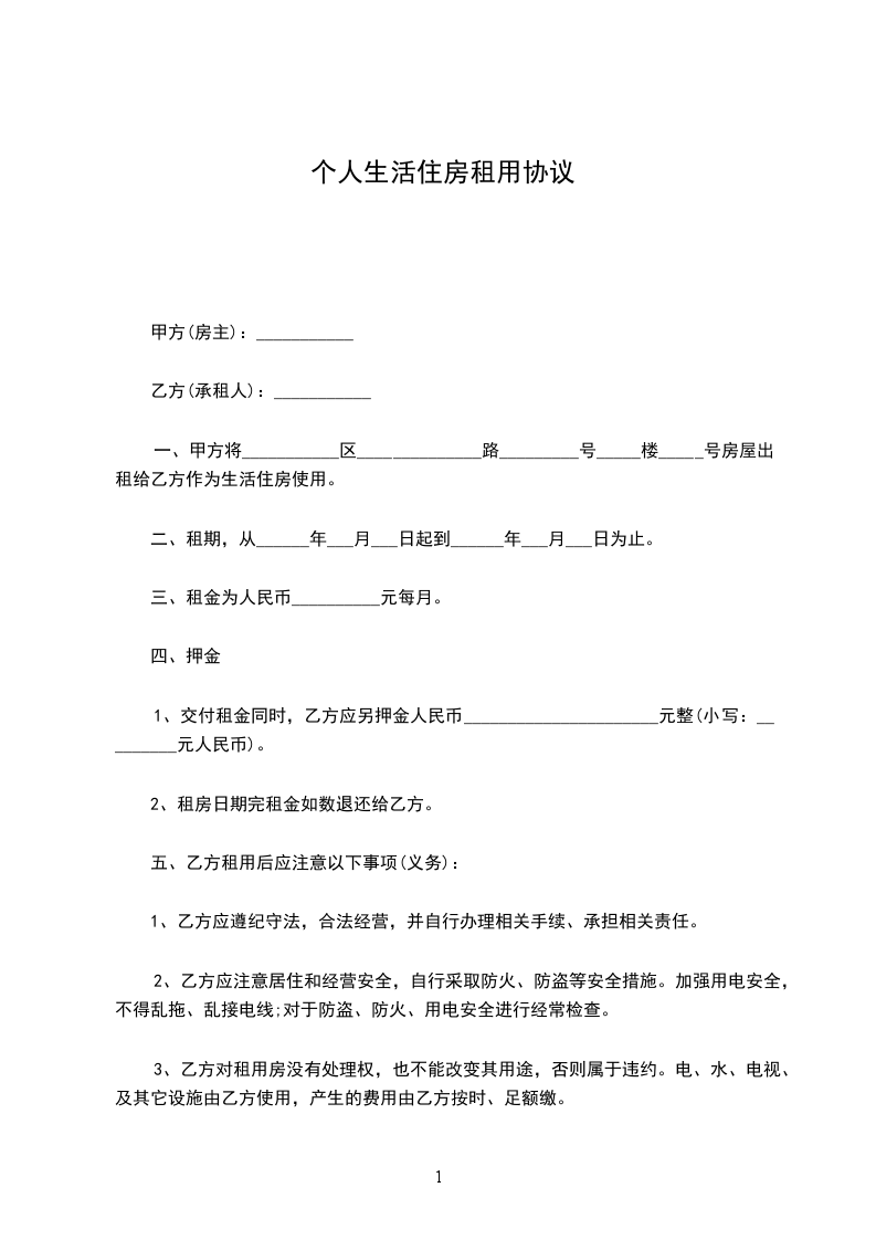 一、甲方将南宁市__________区______________路_________号_____楼_____号房屋出租给乙方作为生活住房使用。