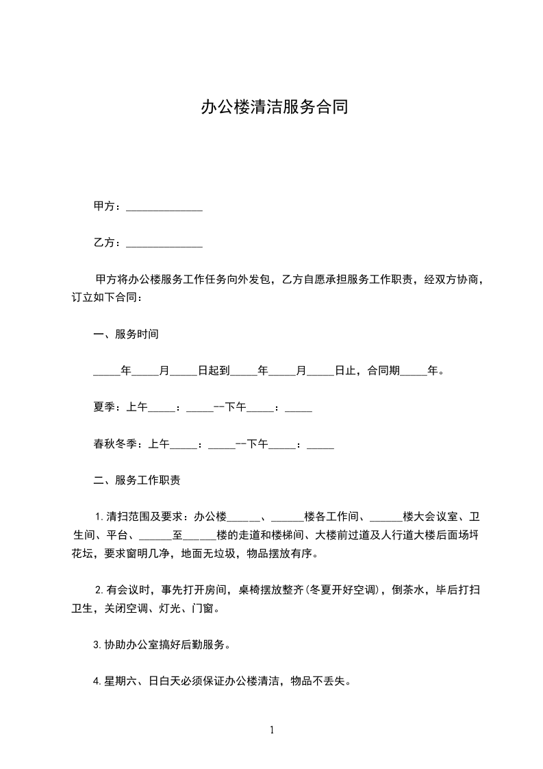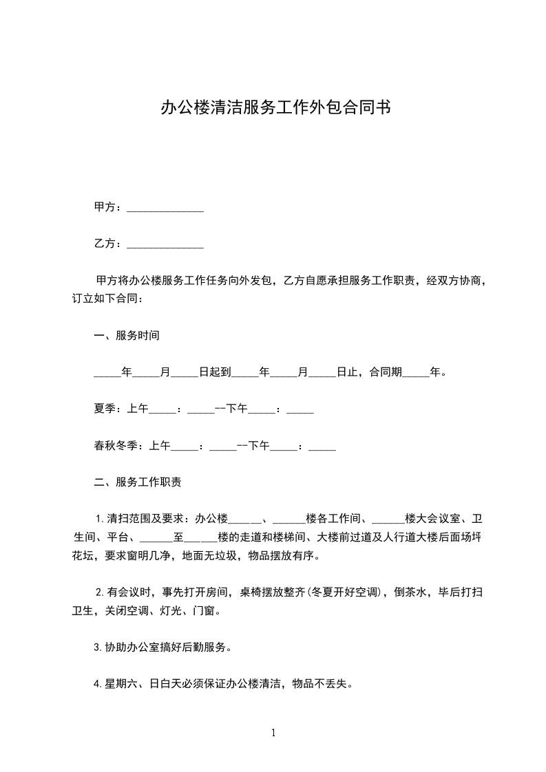 甲方将办公楼服务工作任务向外发包,乙方自愿承担服务工作职责,经双方协商,订立如下合同: