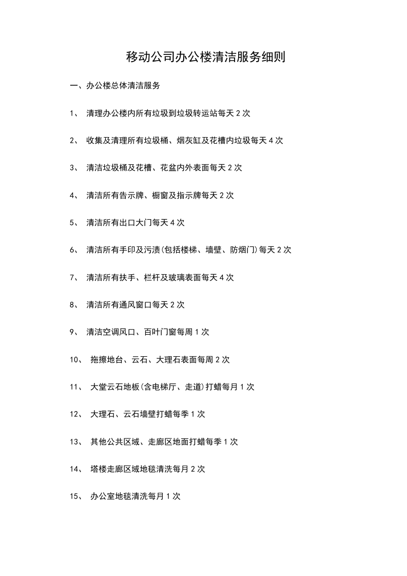 1.清扫范围及要求:办公楼______、______楼各工作间、______楼大会议室、卫生间、平台、______至______楼的走道和楼梯间、大楼前过道及人行道大楼后面场坪花坛,要求窗明几净,地面无垃圾,物品摆放有序。