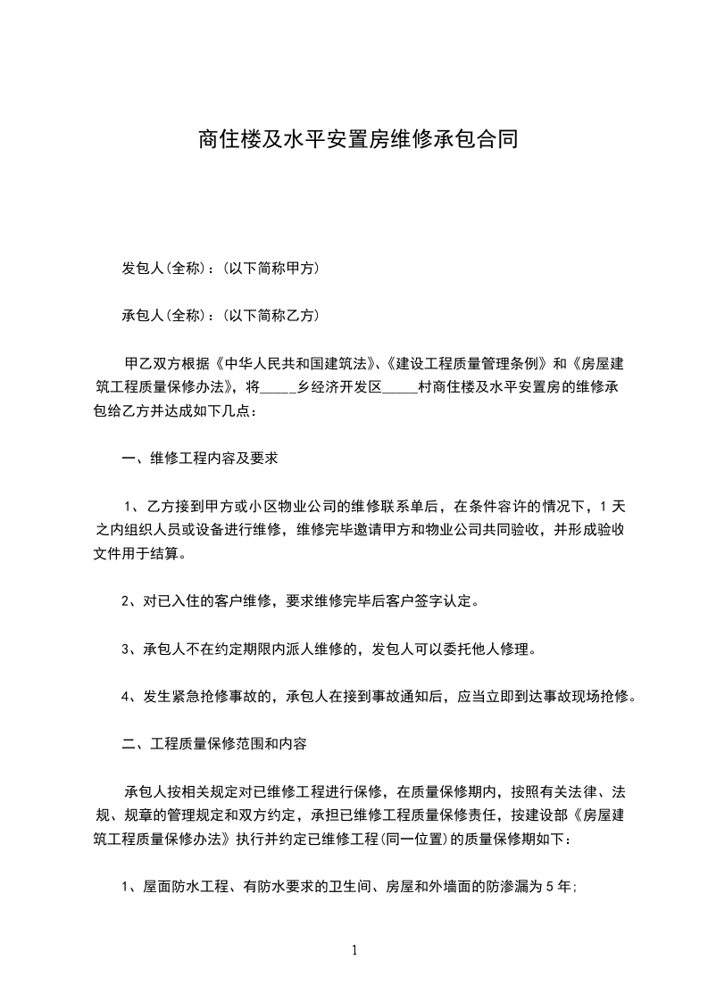 甲乙双方根据《中华人民共和国建筑法》、《建设工程质量管理条例》和《房屋建筑工程质量保修办法》,将_____乡经济开发区_____村商住楼及水平安置房的维修承包给乙方并达成如下几点: