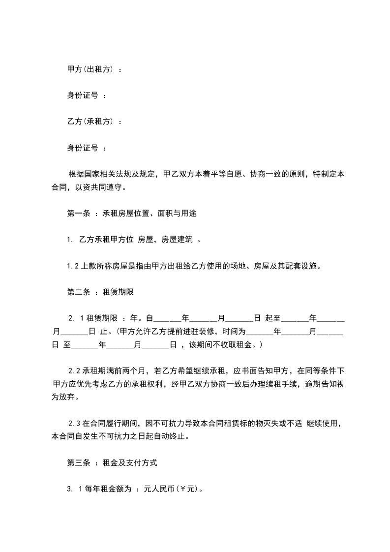 2.1租赁期限:年。自_____年_____月_____日 起至_____年_____月_____日 止。(甲方允许乙方提前进驻装修,时间为_____年_____月_____日 至_____年_____月_____日 ,该期间不收取租金。)