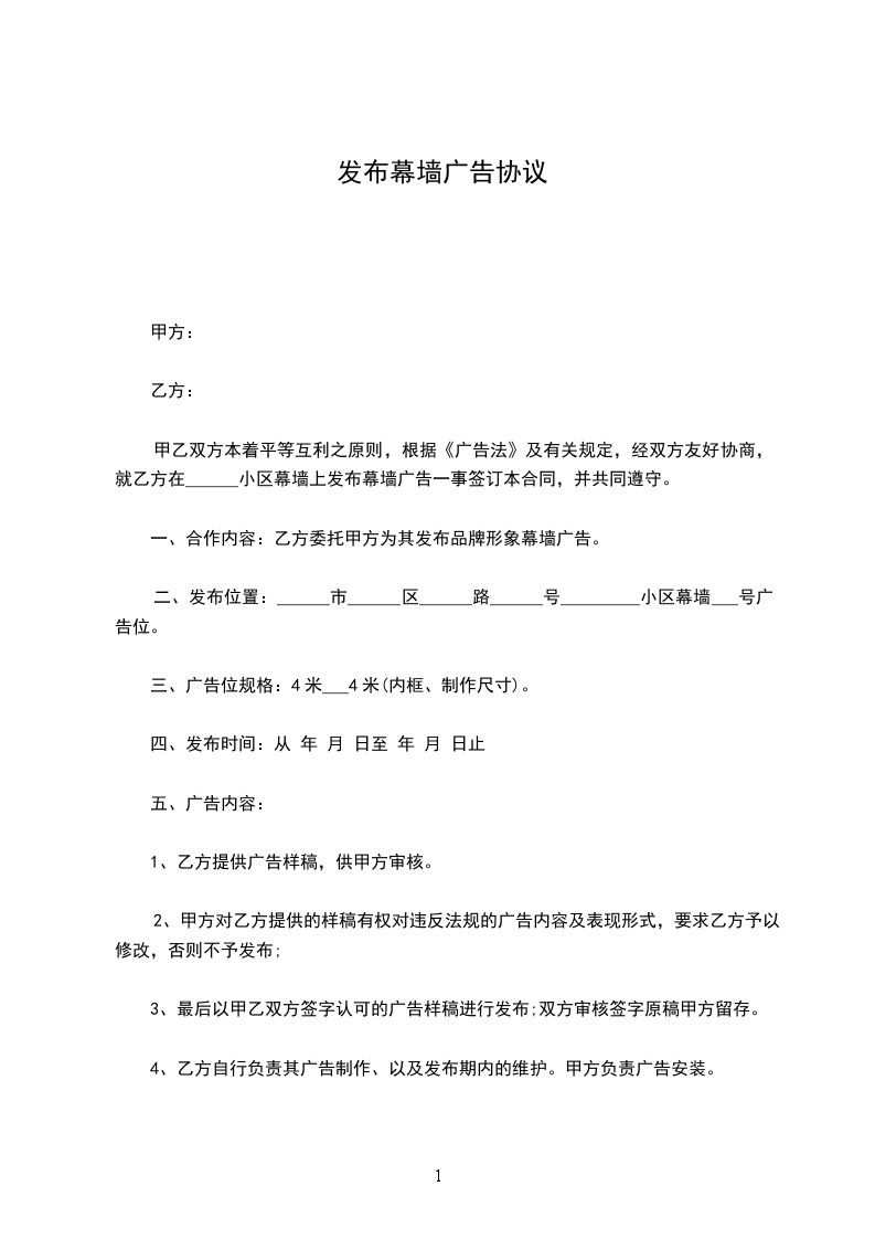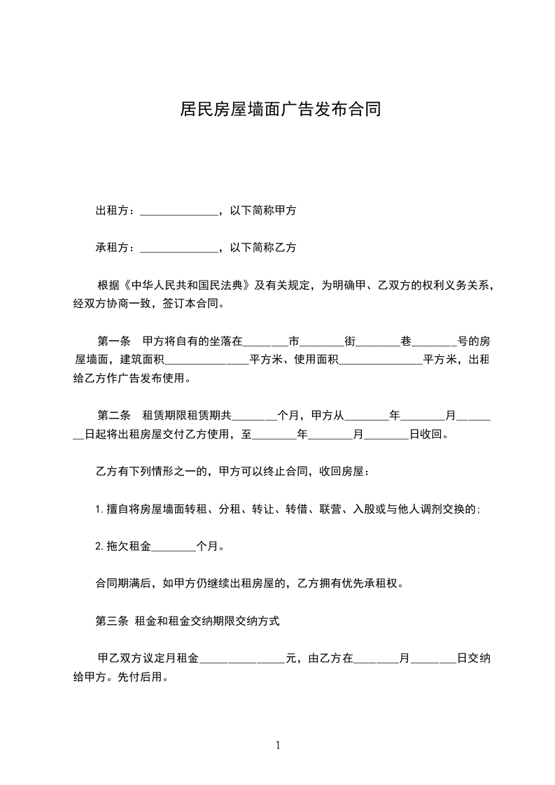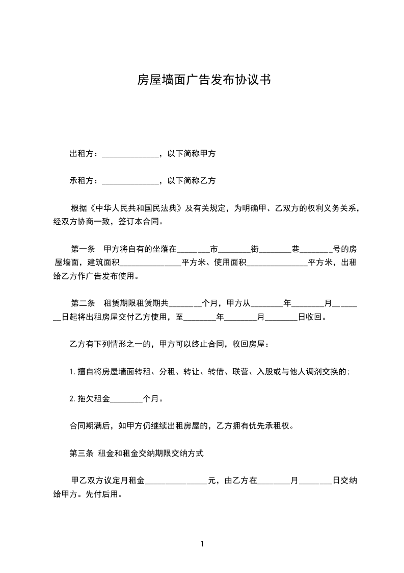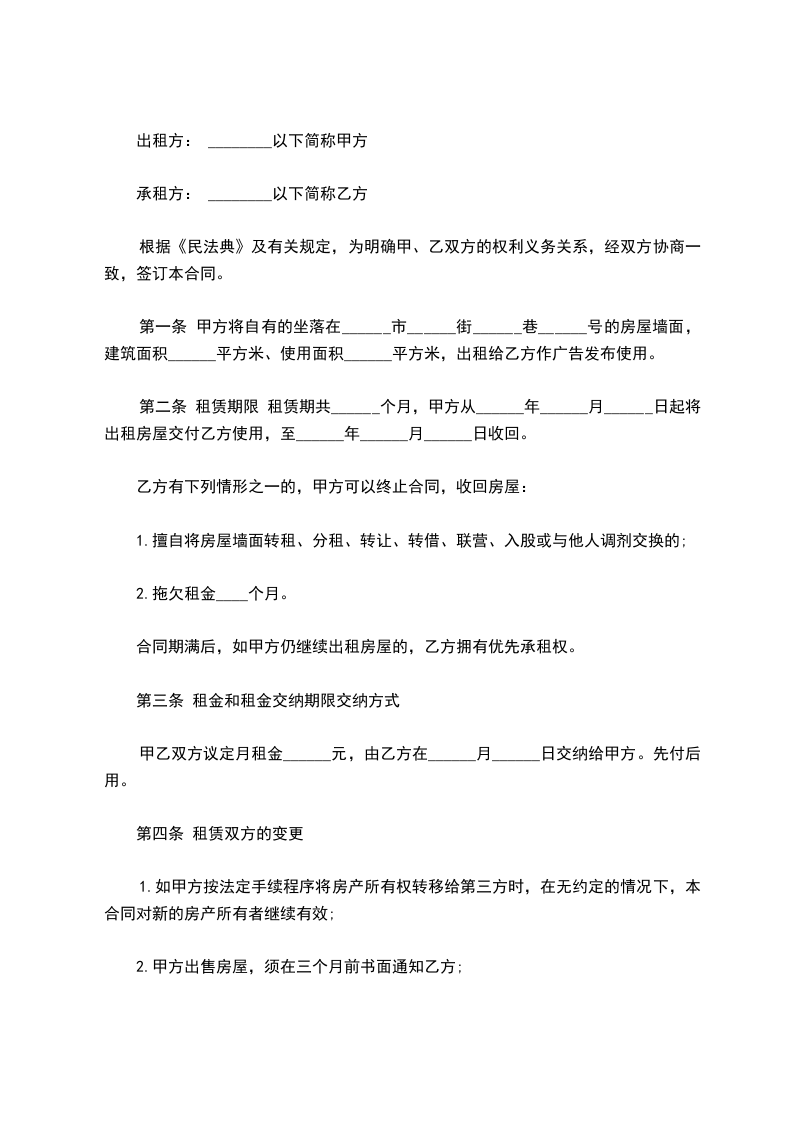 第一条 甲方将自有的坐落在________市________街________巷________号的房屋墙面,建筑面积_______________平方米、使用面积_______________平方米,出租给乙方作广告发布使用。