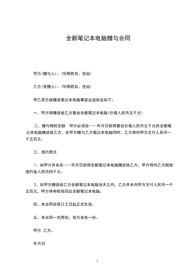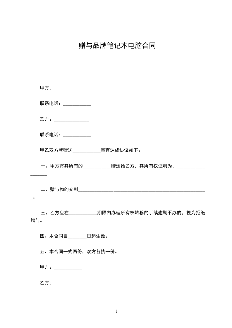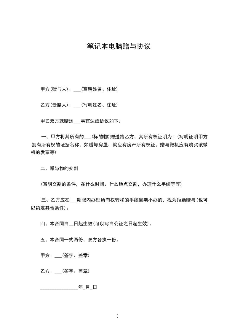 一、甲方将其所有的___(标的物)赠送给乙方,其所有权证明为:(写明证明甲方拥有所有权的证据名称,如赠与房屋,就应有房产所有权证,赠与微机应有购买该微机的发票等)