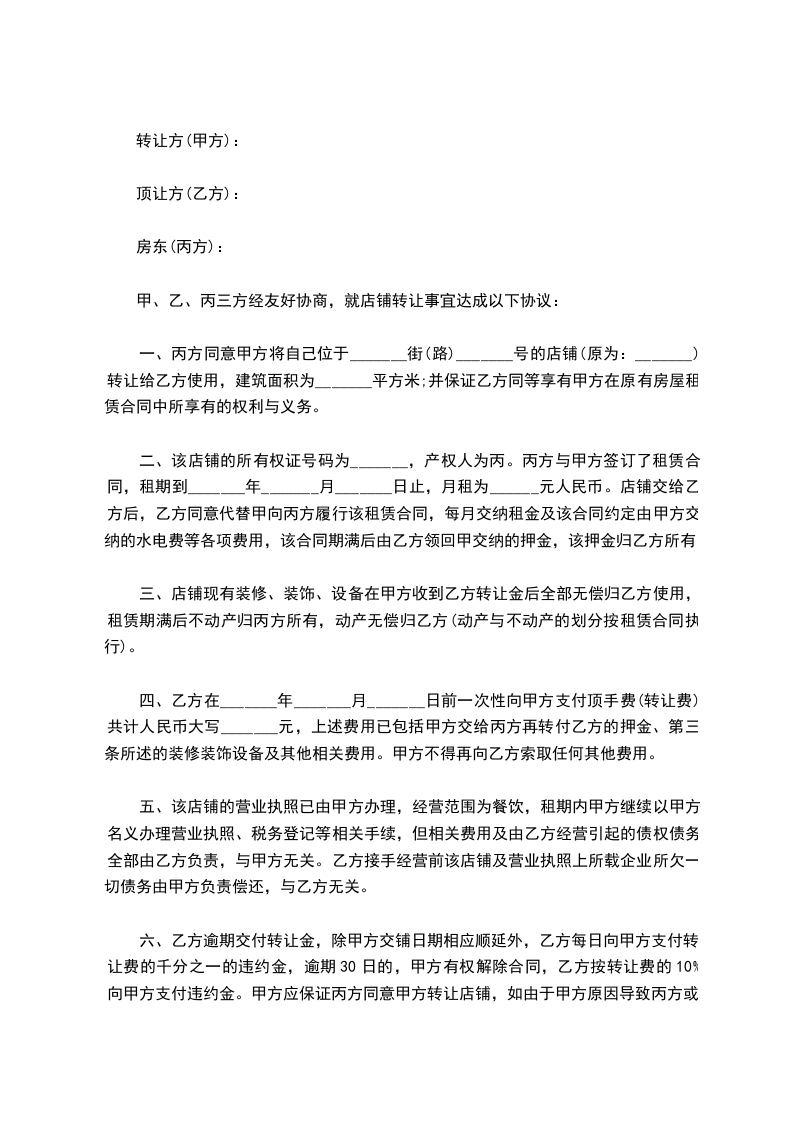 甲、乙、丙三方经友好协商,就店铺转让事宜达成以下协议: