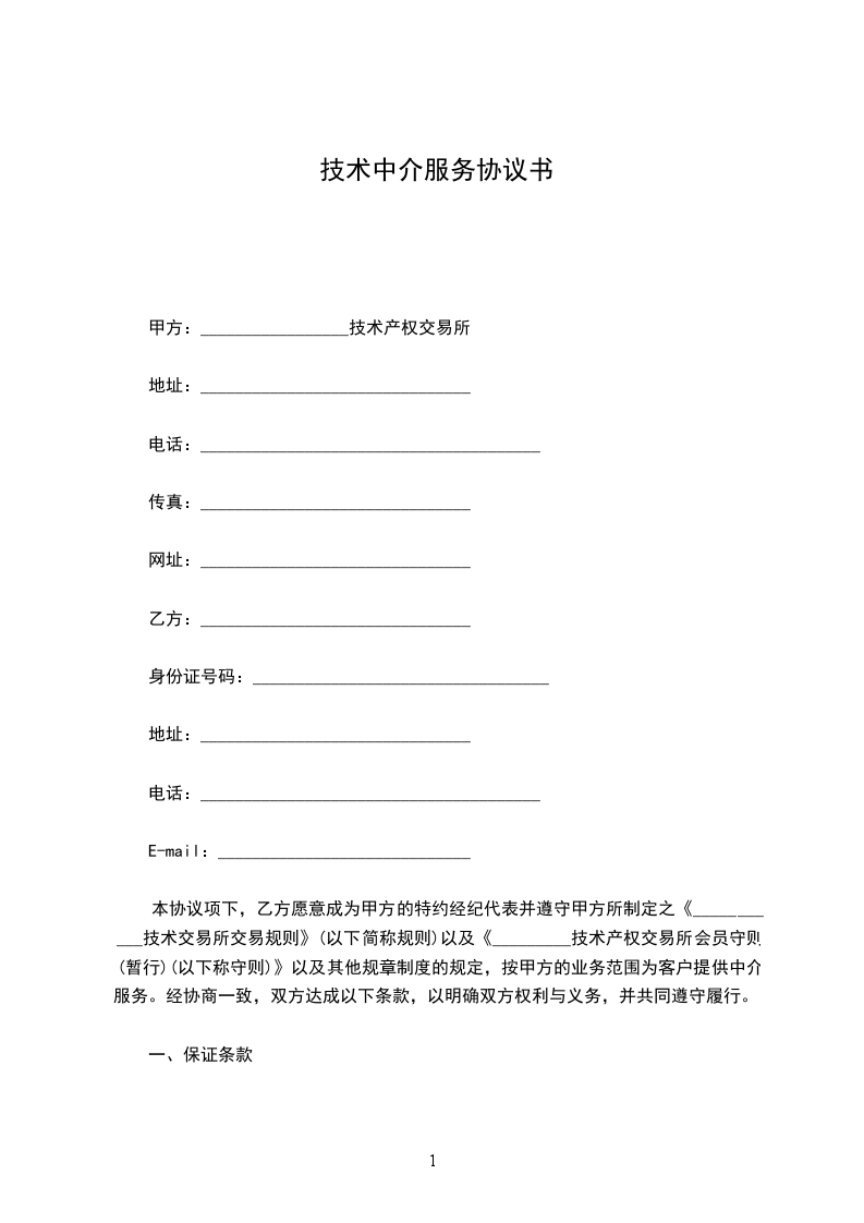 本协议项下,乙方愿意成为甲方的特约经纪代表并遵守甲方所制定之《___________技术交易所交易规则》(以下简称规则)以及《_________技术产权交易所会员守则(暂行)(以下称守则)》以及其他规章制度的规定,按甲方的业务范围为客户提供中介服务。经协商一致,双方达成以下条款,以明确双方权利与义务,并共同遵守履行。