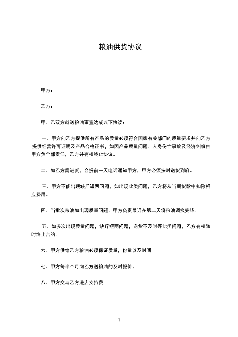 六、甲方供给乙方粮油必须保证质量,份量以及时间。
