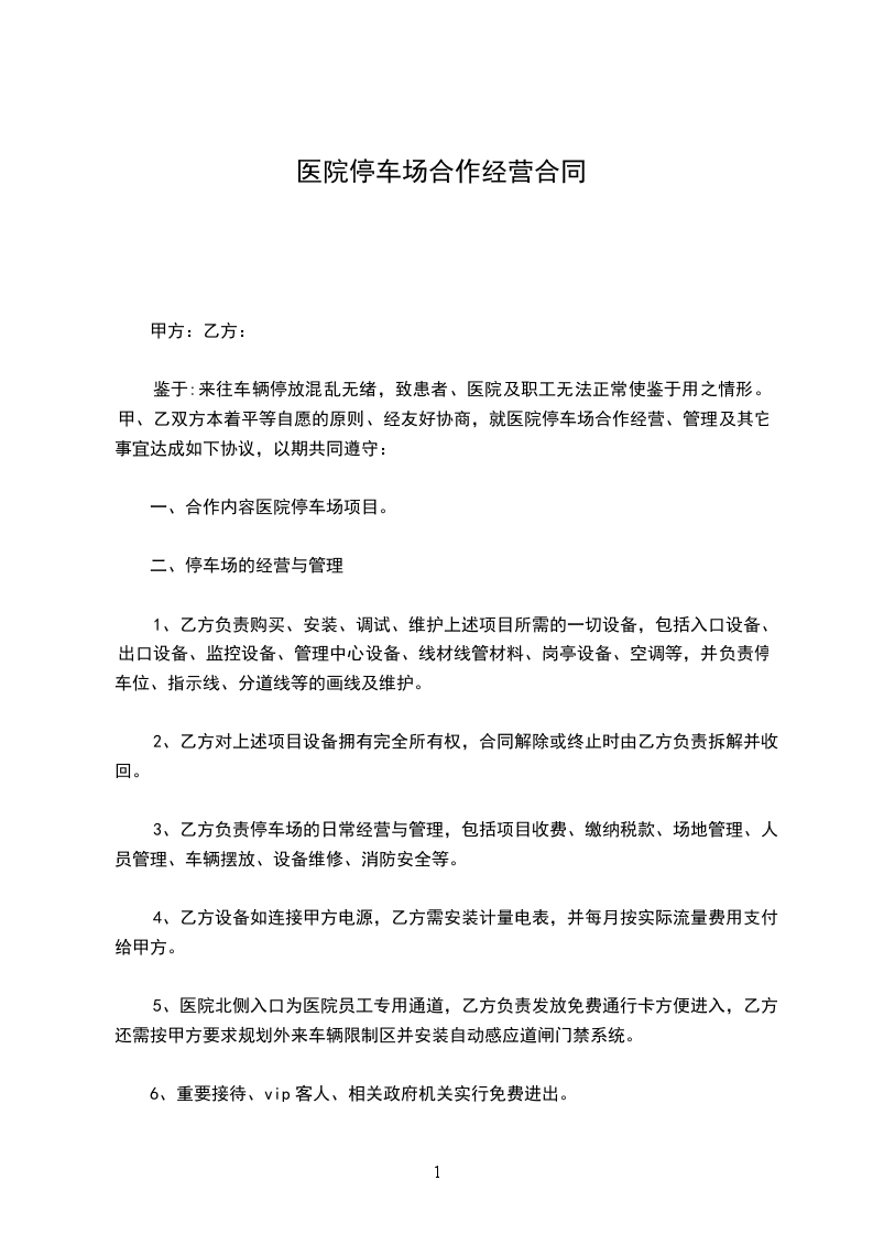 鉴于:来往车辆停放混乱无绪,致患者、医院及职工无法正常使鉴于用之情形。甲、乙双方本着平等自愿的原则、经友好协商,就医院停车场合作经营、管理及其它事宜达成如下协议,以期共同遵守: