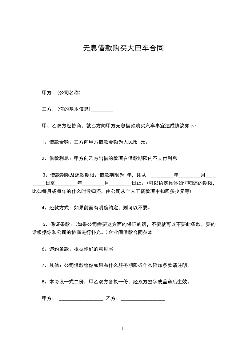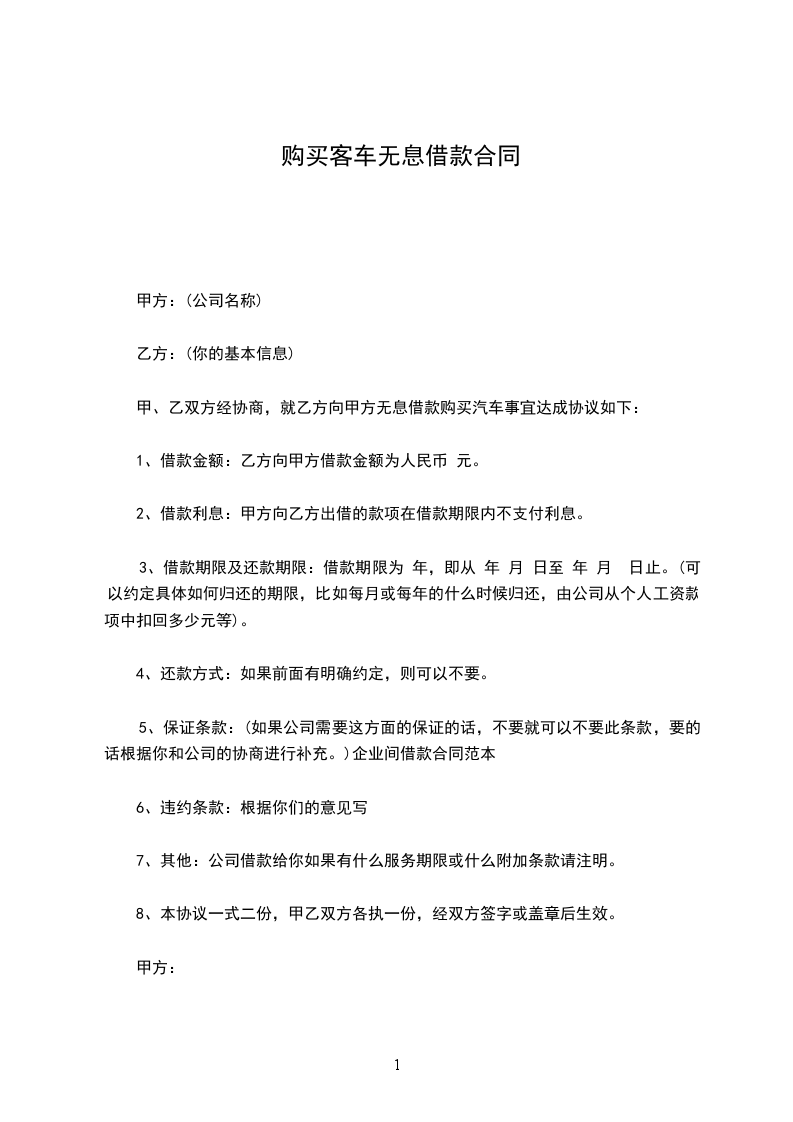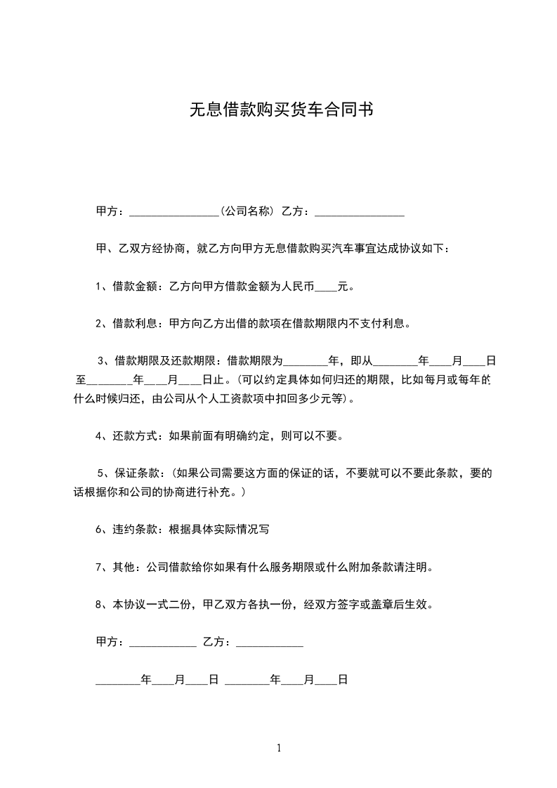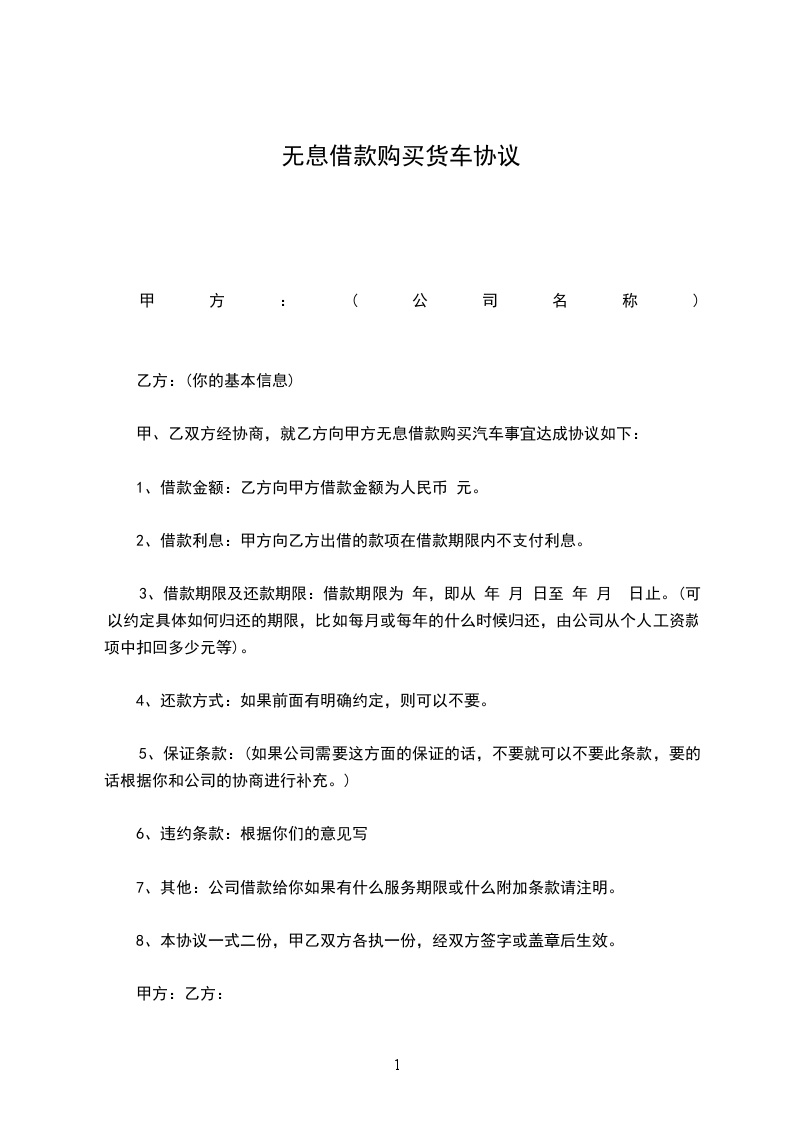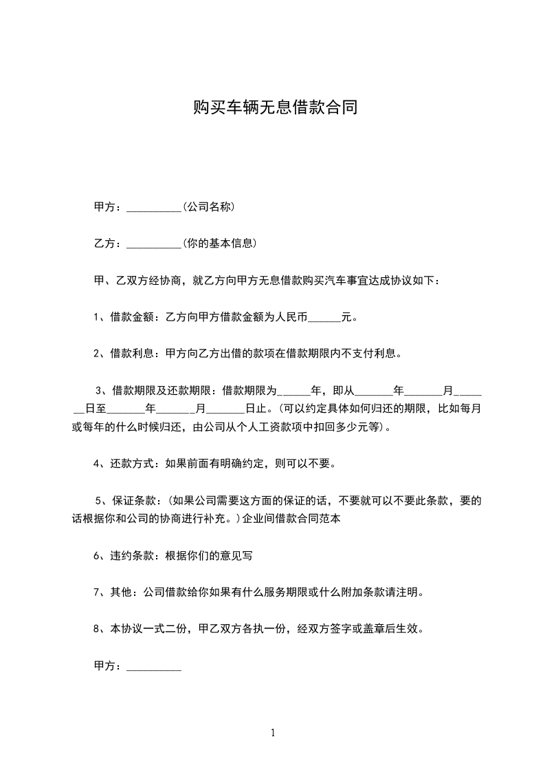 甲、乙双方经协商,就乙方向甲方无息借款购买汽车事宜达成协议如下: