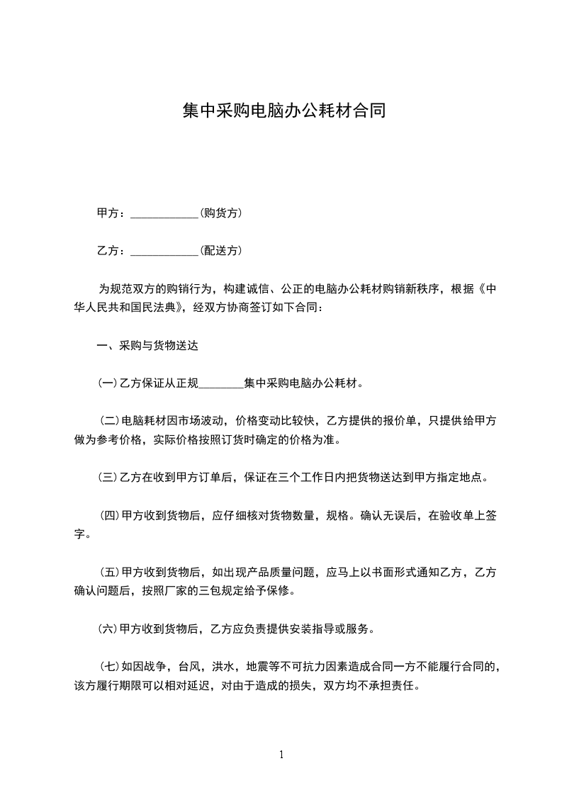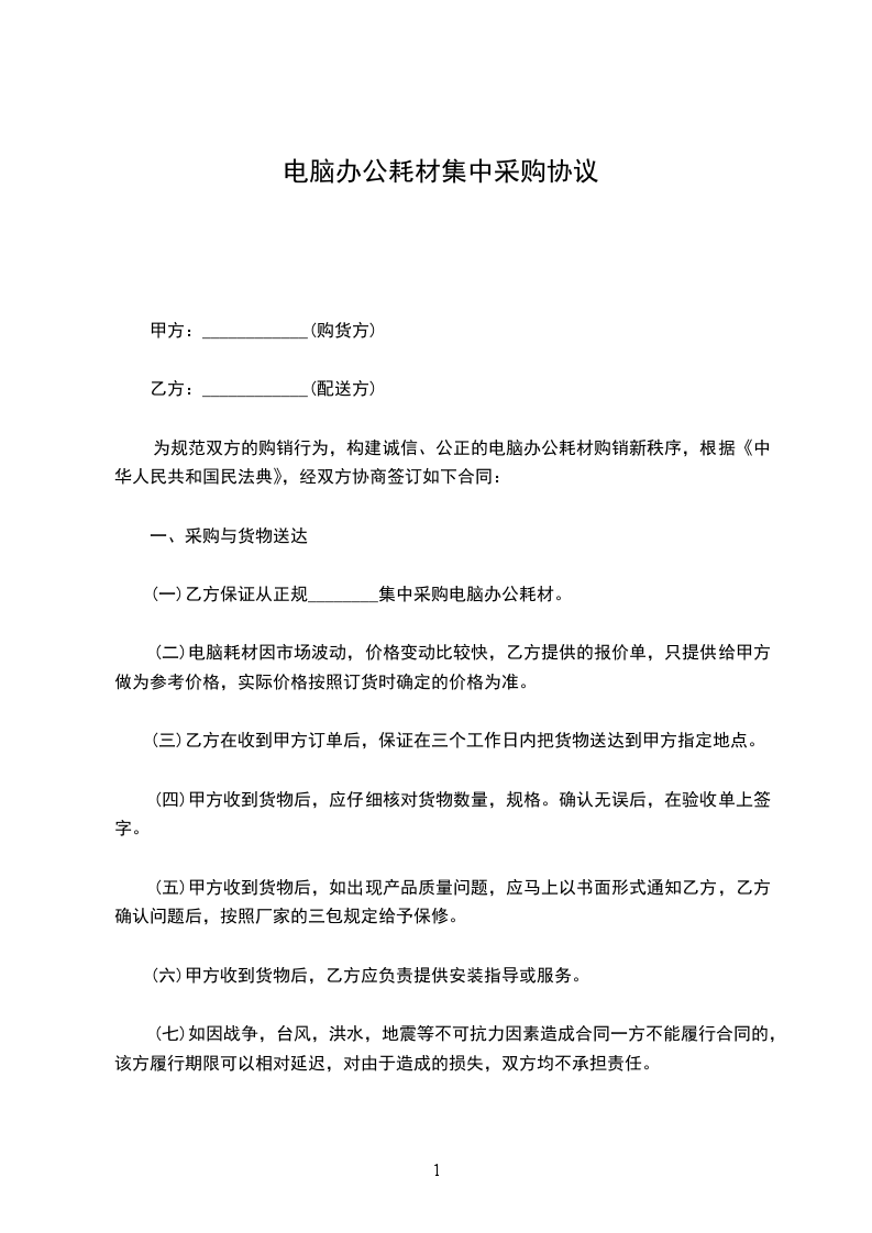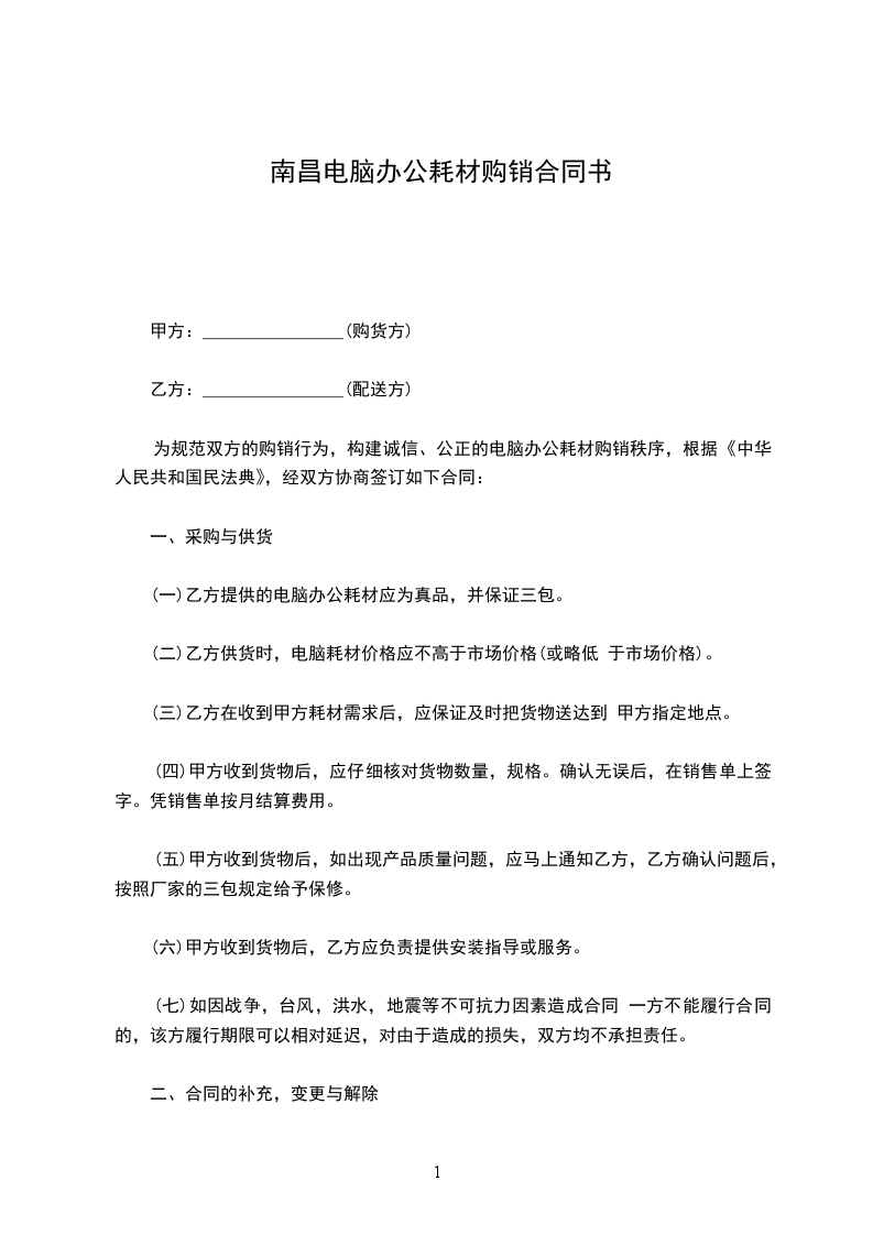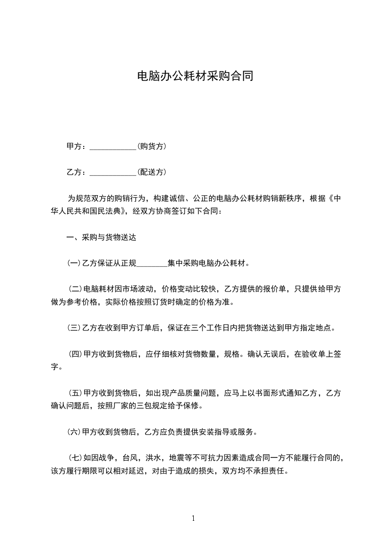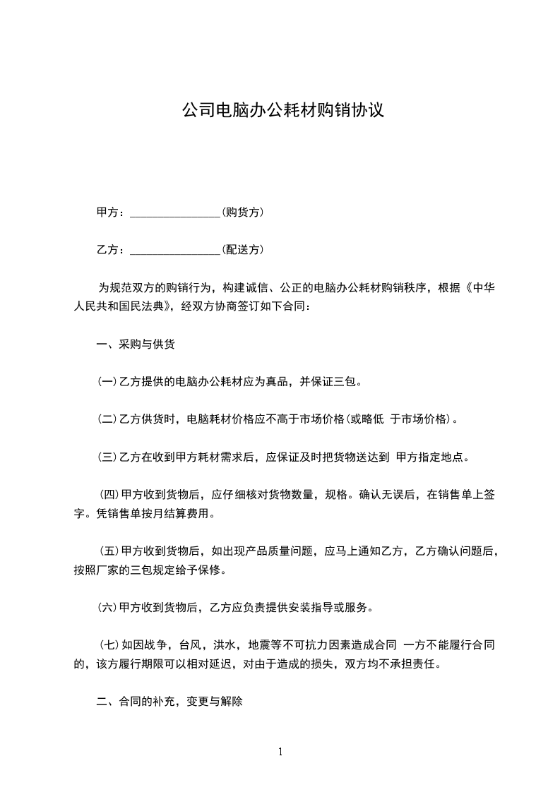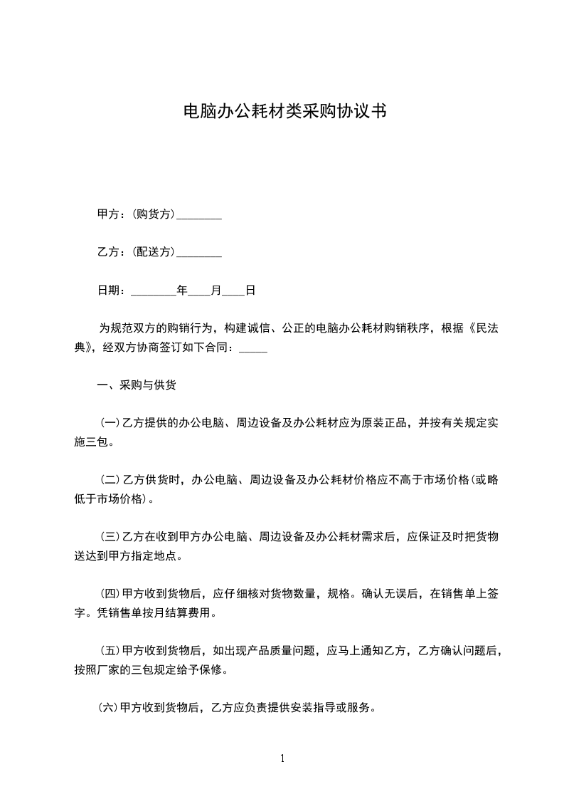 为规范双方的购销行为,构建诚信、公正的电脑办公耗材购销秩序,根据《中华人民共和国民法典》,经双方协商签订如下合同: