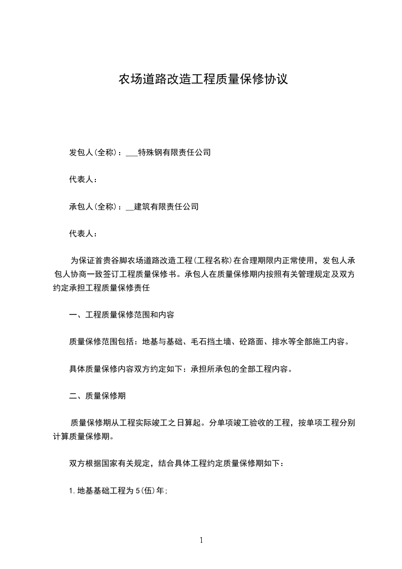 为保证首贵谷脚农场道路改造工程(工程名称)在合理期限内正常使用,发包人承包人协商一致签订工程质量保修书。承包人在质量保修期内按照有关管理规定及双方约定承担工程质量保修责任