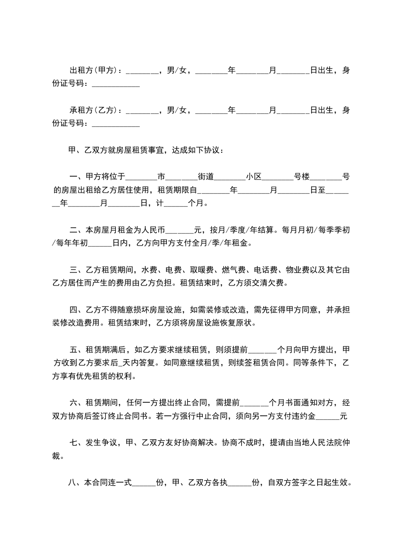 一、甲方将位于________市________街道________小区________号楼________号的房屋出租给乙方居住使用,租赁期限自________年________月________日至________年________月________日,计______个月。