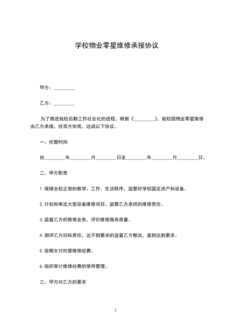 为了推进我校后勤工作社会化的进程,根据《_________》,就校园物业零星维修由乙方承接,经双方协商,达成以下协议。