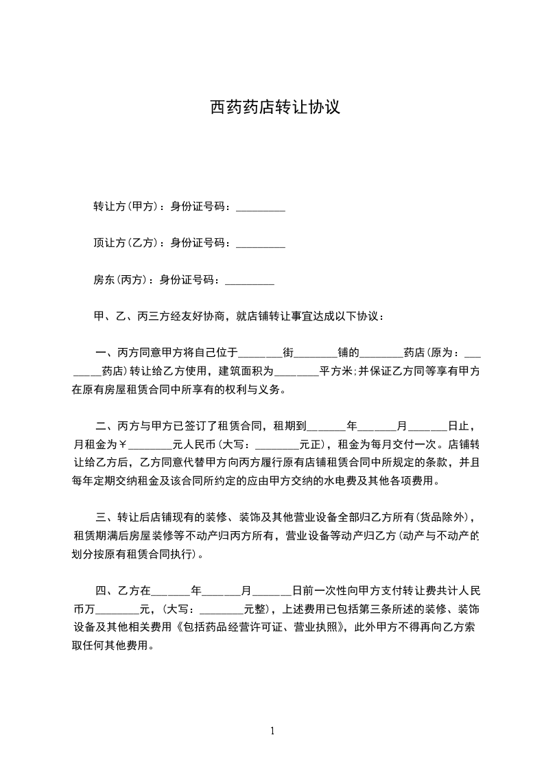 一、丙方同意甲方将自己位于________街________铺的________药店(原为:________药店)转让给乙方使用,建筑面积为________平方米;并保证乙方同等享有甲方在原有房屋租赁合同中所享有的权利与义务。
