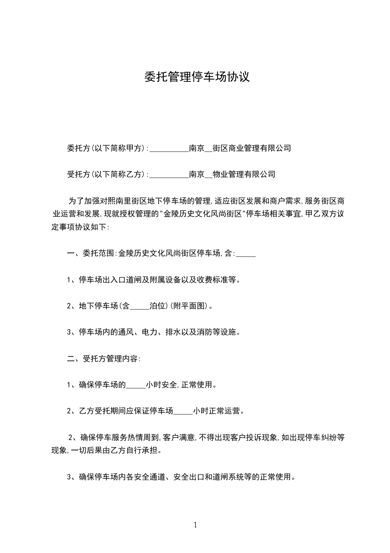 为了加强对熙南里街区地下停车场的管理,适应街区发展和商户需求,服务街区商业运营和发展,现就授权管理的"金陵历史文化风尚街区"停车场相关事宜,甲乙双方议定事项协议如下:
