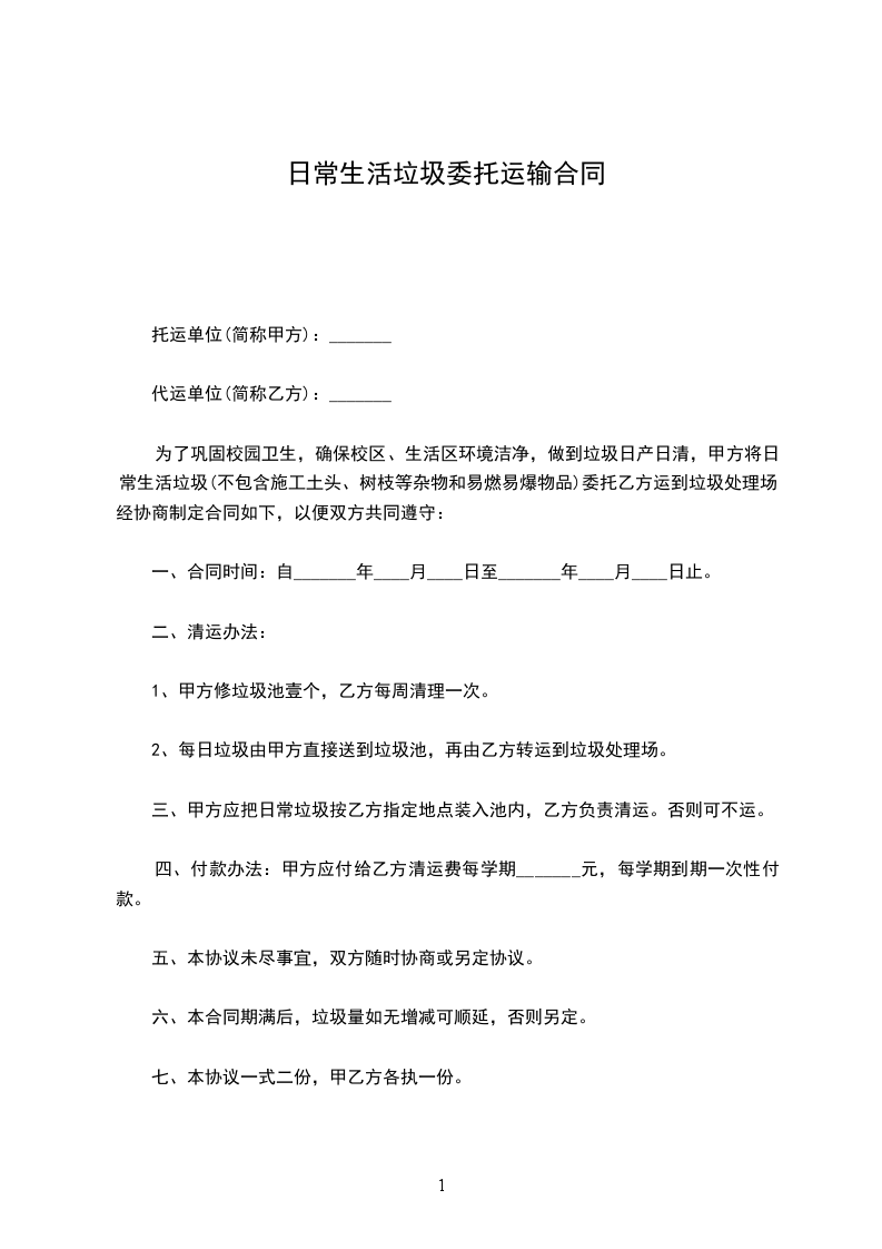为了巩固校园卫生,确保校区、生活区环境洁净,做到垃圾日产日清,甲方将日常生活垃圾(不包含施工土头、树枝等杂物和易燃易爆物品)委托乙方运到垃圾处理场,经协商制定合同如下,以便双方共同遵守:
