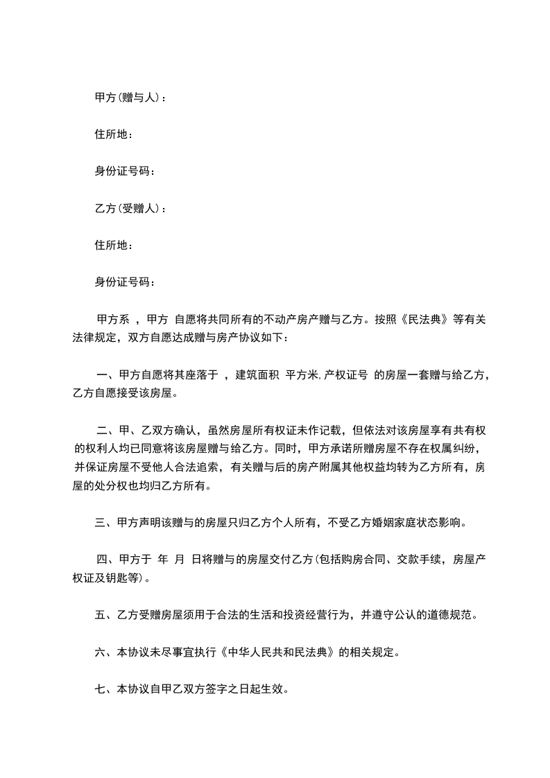 赠与人___________(以下简称甲方)、受赠人___________(以下简称乙方)双方缔结如下赠与合同: