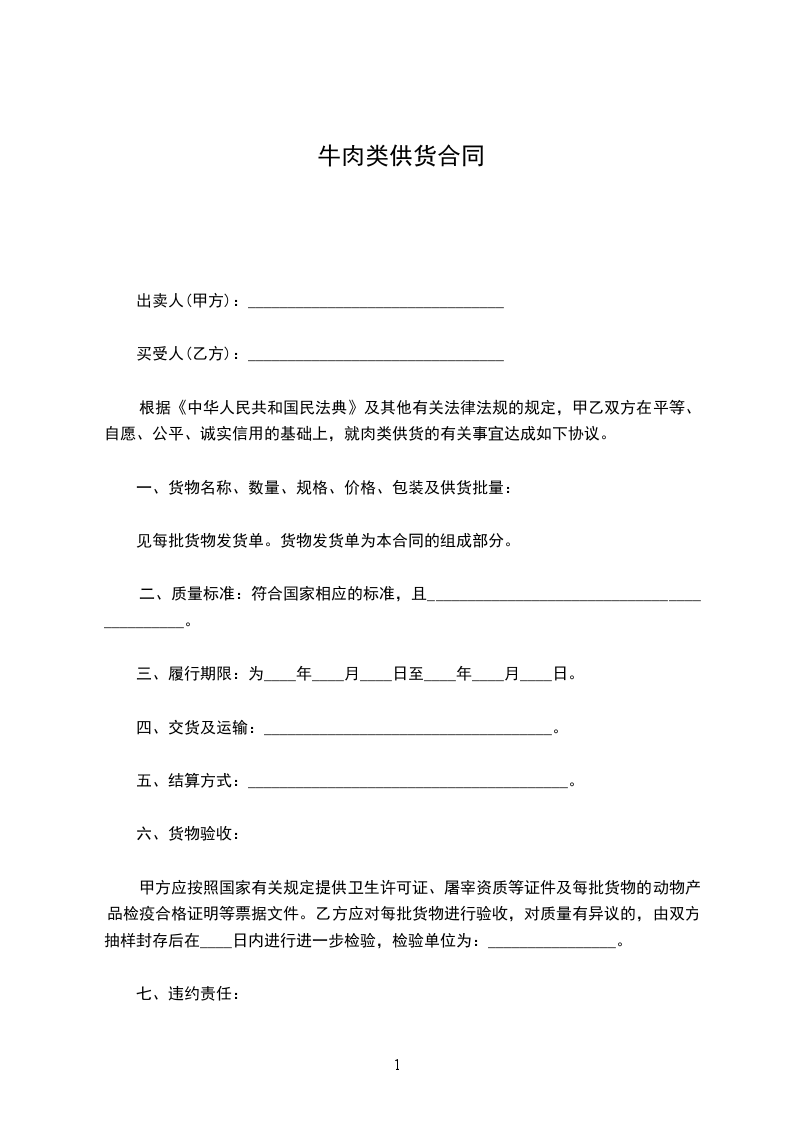 根据《中华人民共和国民法典》及其他有关法律法规的规定,甲乙双方在平等、自愿、公平、诚实信用的基础上,就肉类供货的有关事宜达成如下协议。