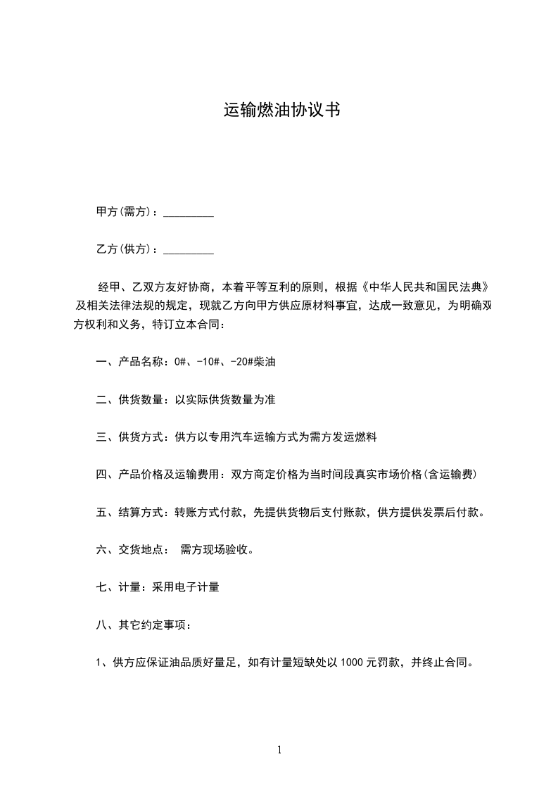1、供方应保证油品质好量足,如有计量短缺处以1000元罚款,并终止合同。