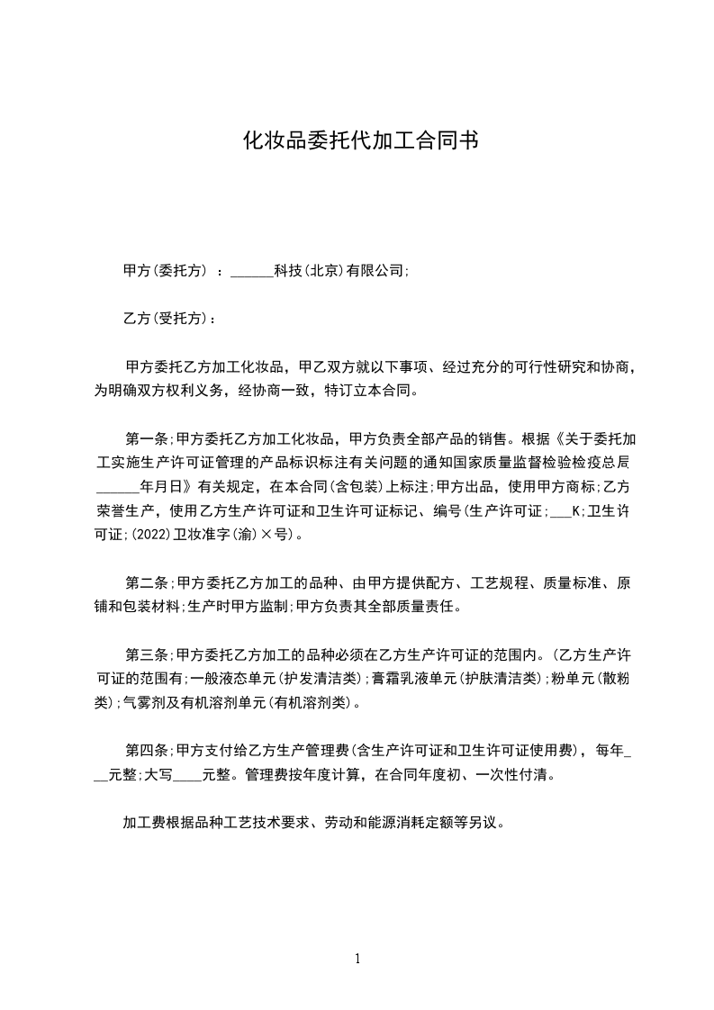 第一条;甲方委托乙方加工化妆品,甲方负责全部产品的销售。根据《关于委托加工实施生产许可证管理的产品标识标注有关问题的通知国家质量监督检验检疫总局____年_月_日》有关规定,在本合同(含包装)上标注;甲方出品,使用甲方商标;乙方荣誉生产,使用乙方生产许可证和卫生许可证标记、编号。