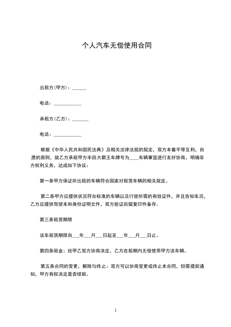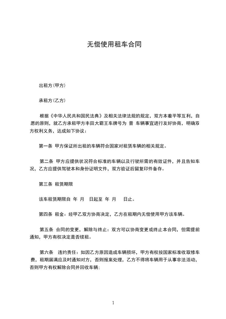根据《中华人民共和国民法典》及相关法律法规的规定,双方本着平等互利,自愿的原则,就乙方承租甲方丰田大霸王车牌号为____车辆事宜进行友好协商,明确双方权利义务,达成如下协议:
