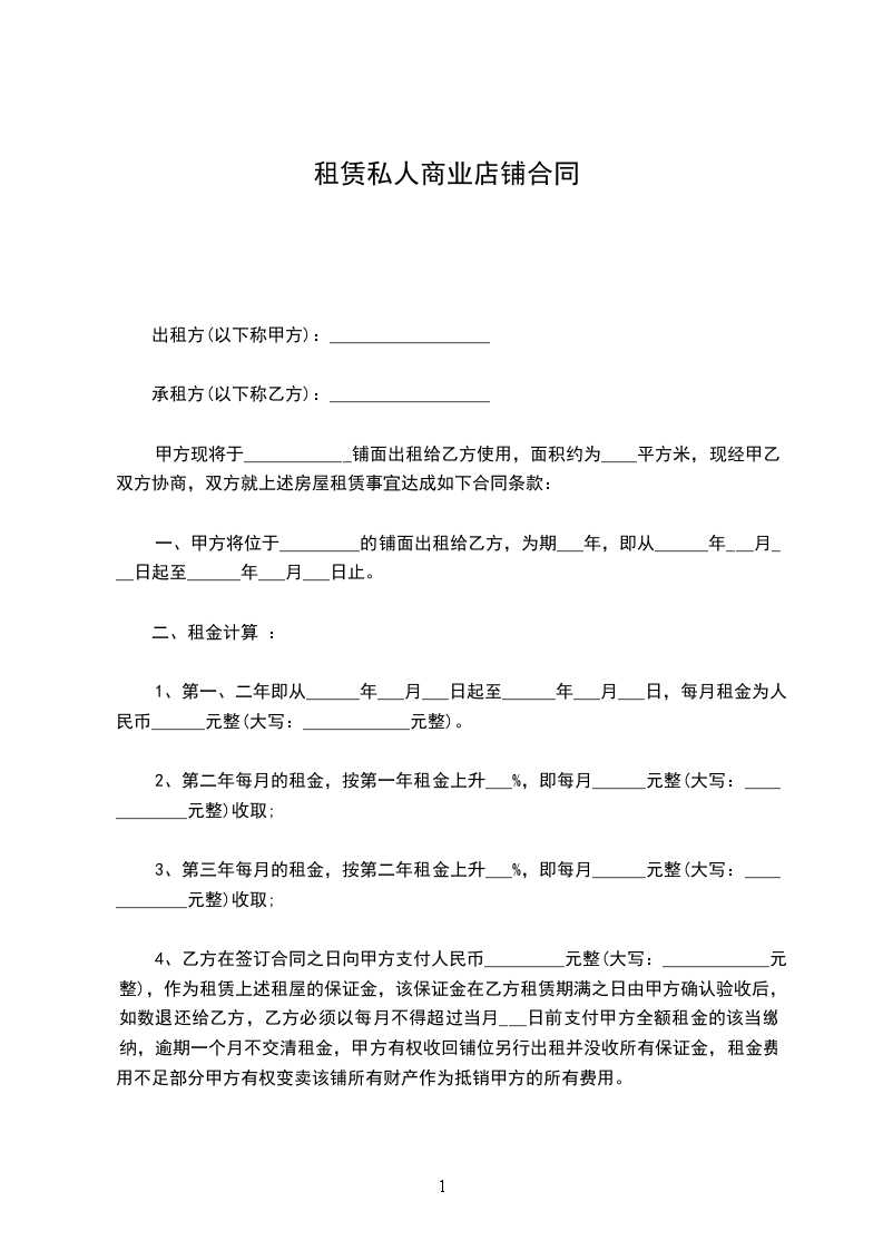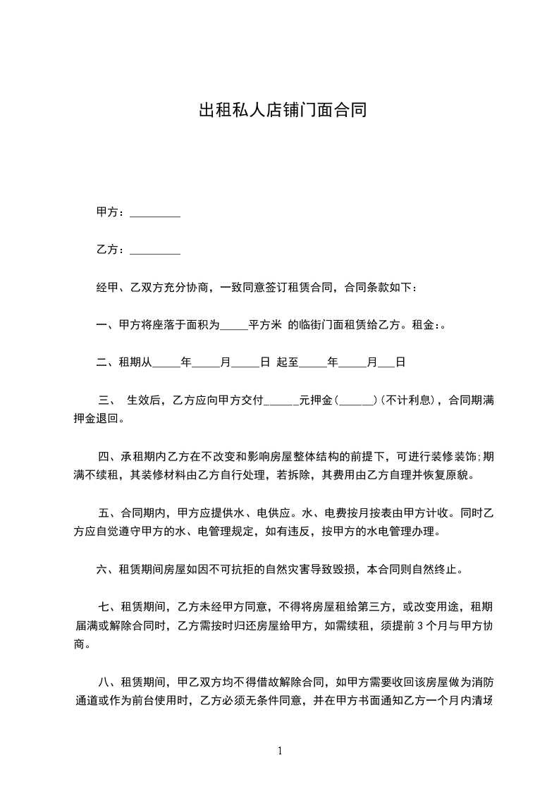 一、甲方将位于______________________________________________一间面积为___________平方米的_____(临街或社区)铺面租赁给乙方,作_______________经营使用,铺面租赁合同。