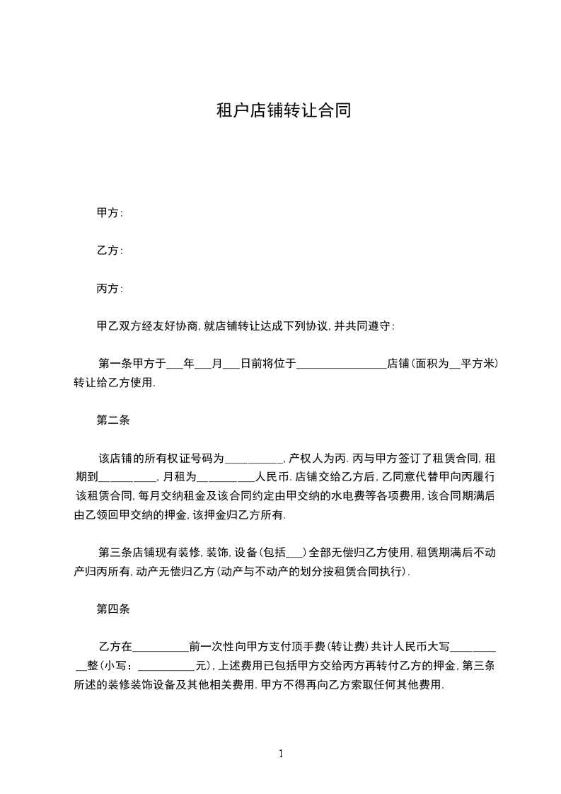 该店铺的所有权证号码为__________,产权人为丙.丙与甲方签订了租赁合同,租期到__________,月租为__________人民币.店铺交给乙方后,乙同意代替甲向丙履行该租赁合同,每月交纳租金及该合同约定由甲交纳的水电费等各项费用,该合同期满后由乙领回甲交纳的押金,该押金归乙方所有.