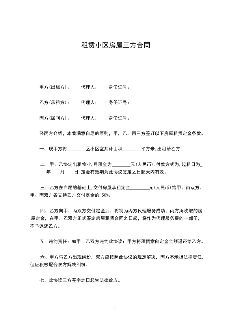 经丙方介绍,本着满意自愿的原则,甲,乙,丙三方签订以下房屋租赁定金条款。
