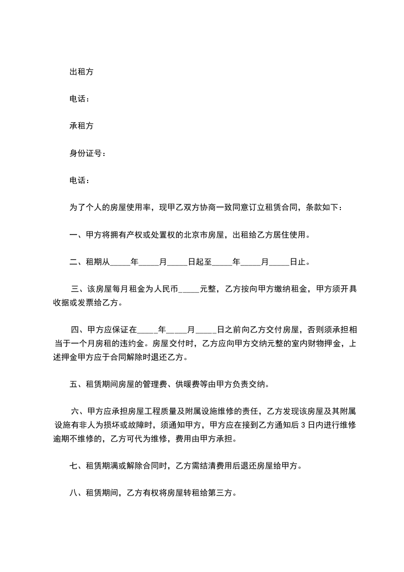 第八条 出租人对于转租人将租赁房屋一部转租与承租人的应予以同意。 本合同一式四份,当事人及连带保证人各执一份为凭。